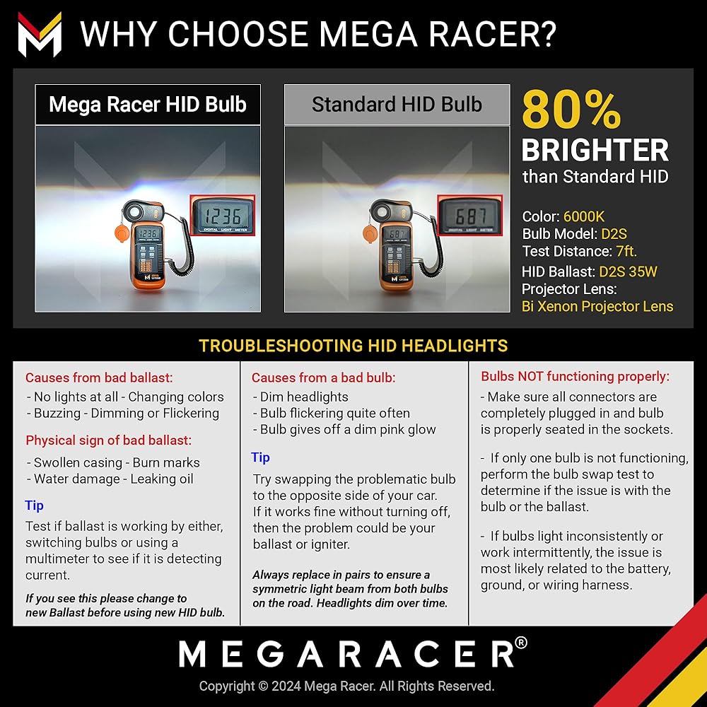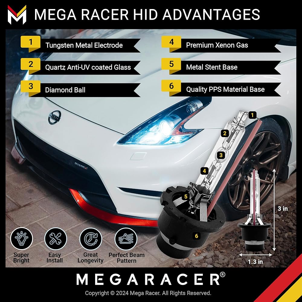 💡أكثر سطوعًا بنسبة 300% من الهالوجين - تحتوي مصابيح زينون D2S HID من Mega Racer على تصميم نمط شعاع مركّز يعطي مجالًا بصريًا مثاليًا. تنتج لمبة D2S الخاصة بنا لون أزرق داكن فائق السطوع 10000K، وتمنع حركة المرور القادمة من التسبب في العمى وتمنحك تجربة قيادة خالية من الوهج.