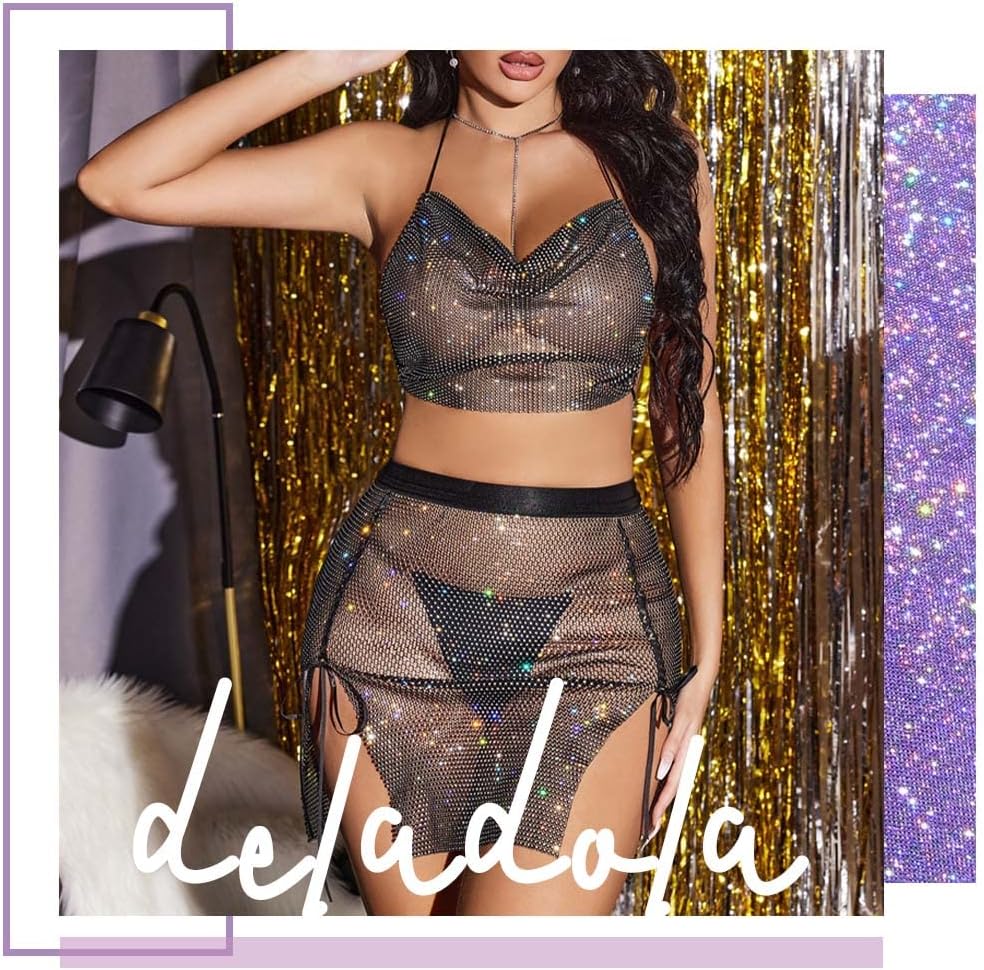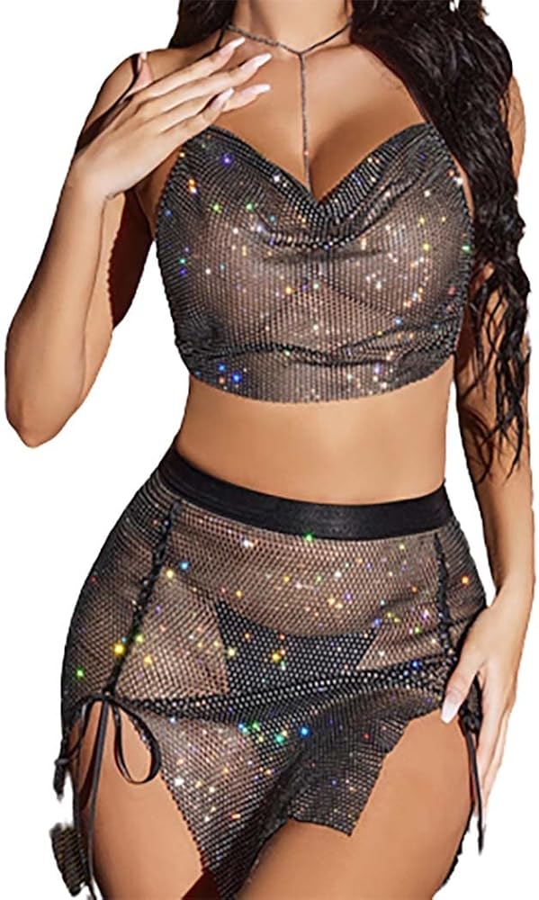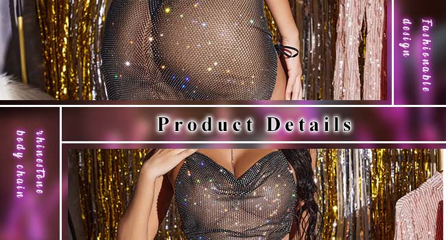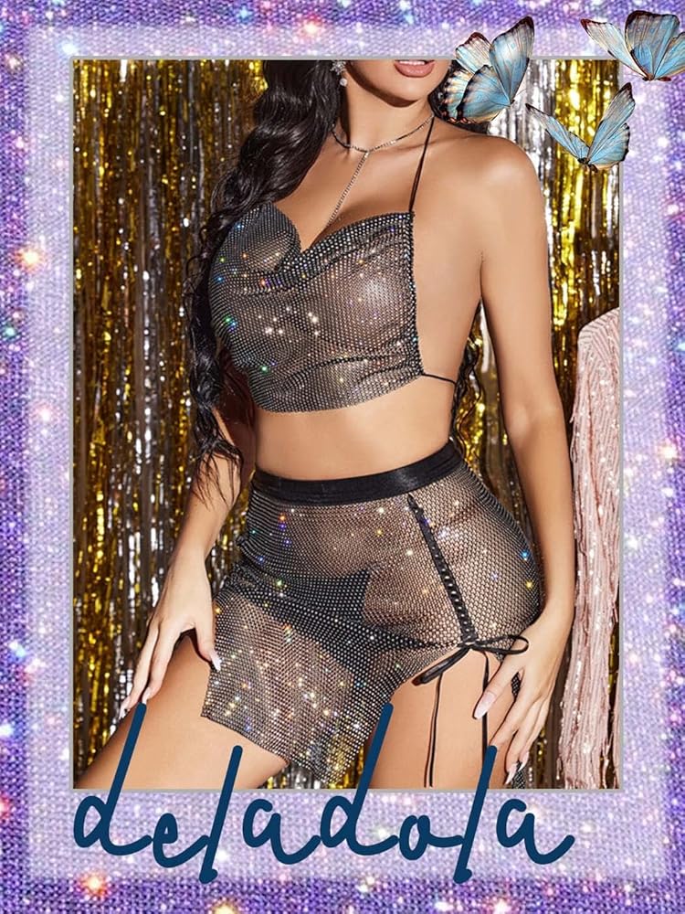 بلوزة وتنورة قصيرة من شبكة صيد السمك مصنوعة من حجر الراين، من خلال تشكيلات مختلفة، يمكنك ارتداء هذه المجموعة الشفافة بعدة طرق مختلفة، يمكنك ارتداؤها كمجموعة ملابس نادي، أو فستان للحفلات، أو فستان يومي وما إلى ذلك. سوف تظهر منحنى جمالك، وأسلوب الموضة الخاص بك ، تحظى بشعبية كبيرة لدى النساء، ومناسبة لمختلف الأعمار والمناسبات.