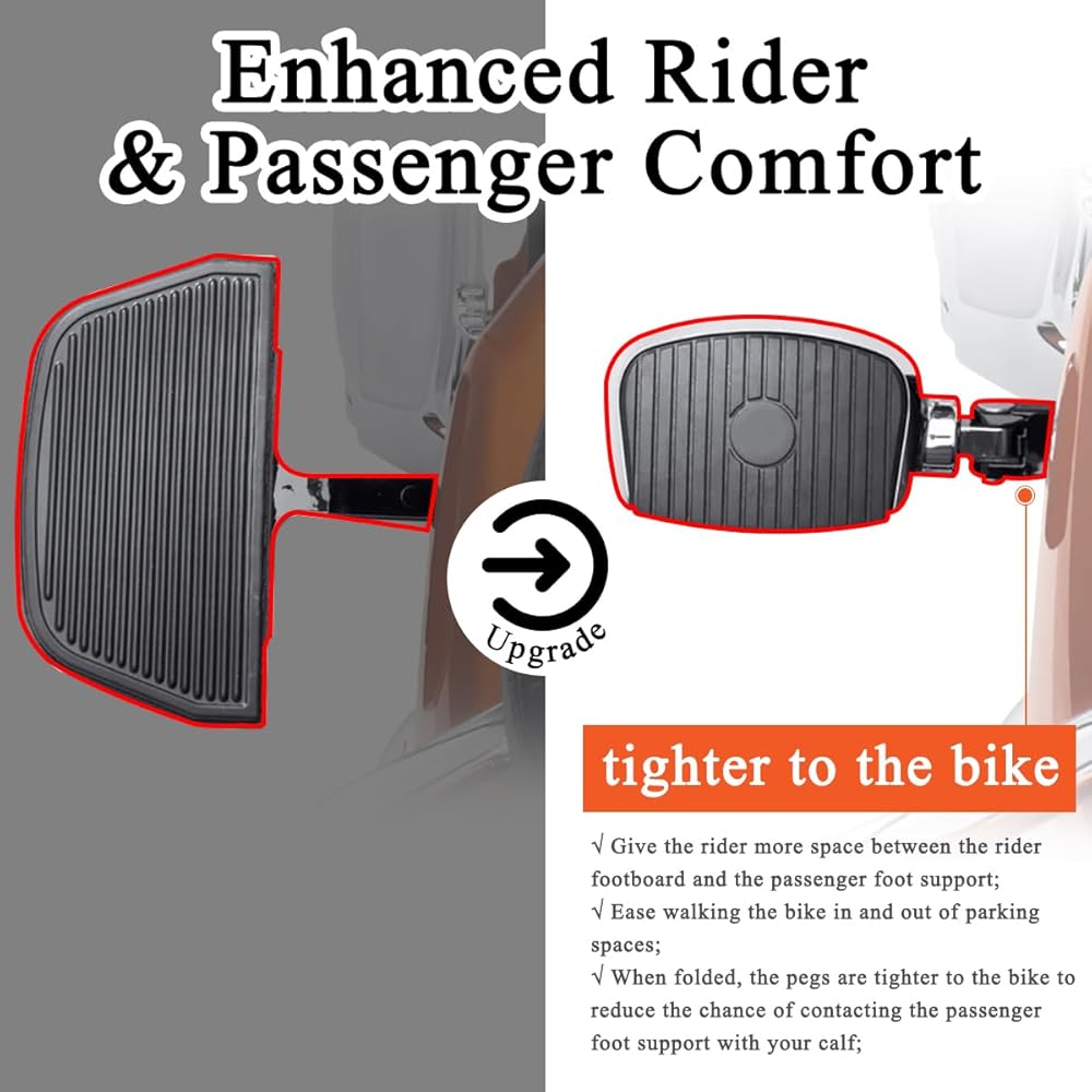 • [راحة معززة للراكب والراكب] تعمل مجموعة التركيب هذه على تحريك قدم الراكب للخلف والداخل لمنح الراكب مساحة أكبر بين لوح قدم الراكب ودعم قدم الراكب. يمهد الوضع الجديد الطريق لقدميك لتسهيل المشي بالدراجة داخل وخارج أماكن وقوف السيارات. عند طيها، تكون الأوتاد أكثر إحكامًا على الدراجة لتقليل فرصة ملامسة دعامة قدم الراكب لساقك؛