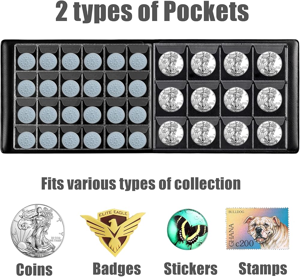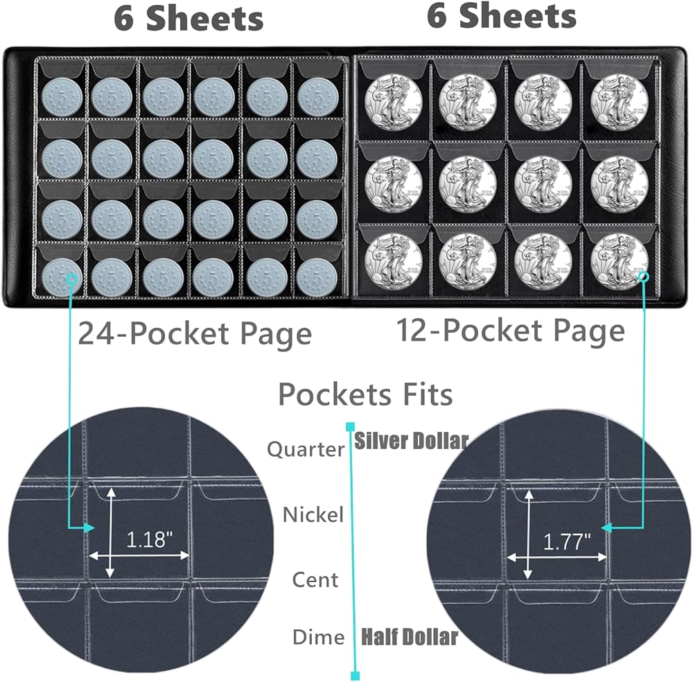 Coin Sleeves Pocket Size : Total 216 pockets,1.18x1.18 inch pocket 144 pockets(1.18x1.18 inch) fits Dime,Cent,Nickel,Quarter Coins. 72 pockets(1.77x1.77 inch) fits Half Dollar, Silver Dollar Coins.