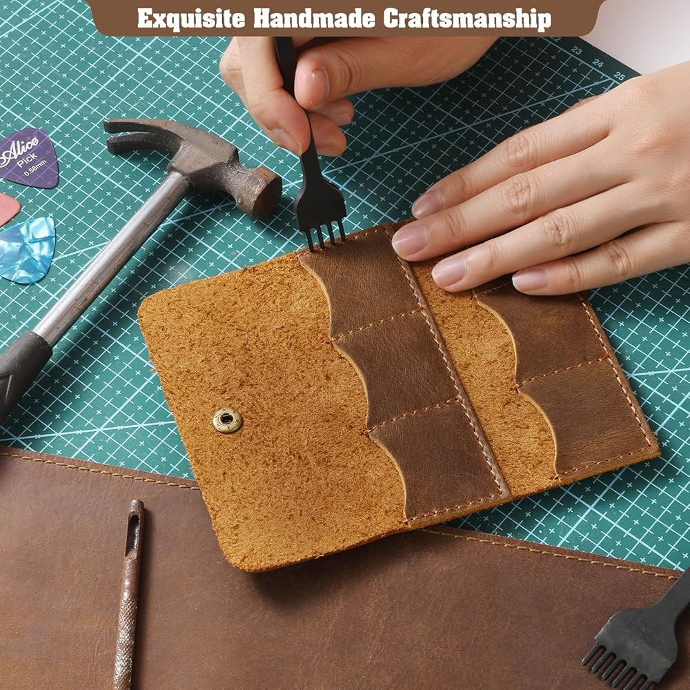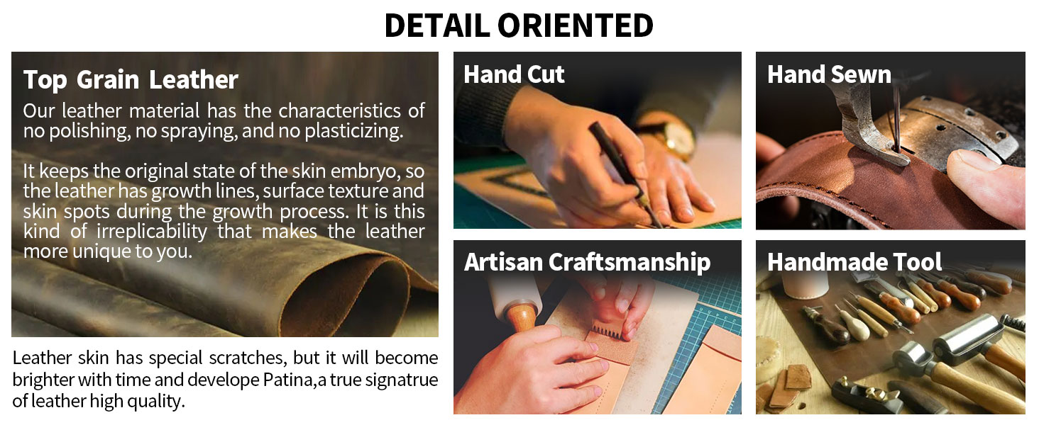 صناعة يدوية - تستخدم حوامل اختيار الجيتار تقنيات خياطة يدوية حرفية، وهي تقنية تقليدية ومستهلكة للوقت تخلق طبقات أكثر ثباتًا وثباتًا، مما يجعل المنتج أكثر متانة ويدوم طويلاً. تضيف حقائب اختيار الجيتار المخيطة يدويًا جمالًا وقيمة للمنتجات الجلدية.