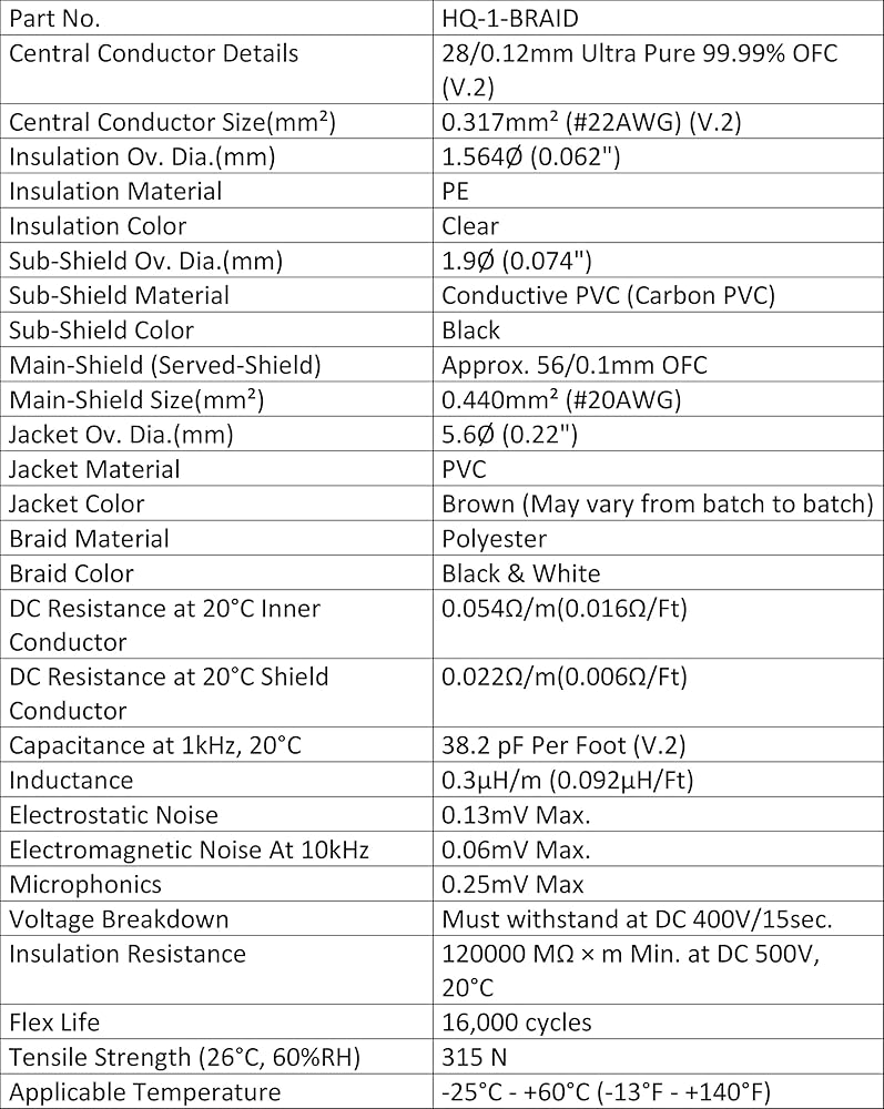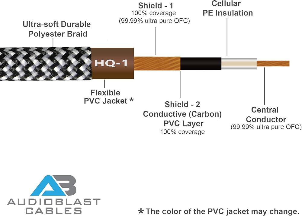 Audioblast HQ-1-BRAID is the most-flexible professional-grade hand-assembled instrument cable ideal for a myriad of patching applications. The conductive PVC sub-shield, served shield & the ultra-pure OFC core ensure higher levels of signal transparency & quality, cancelling almost all electrical interference & microphonics. Low capacitance of the HQ-1 (38.2pf / foot) will always faithfully bring out the true tone of your instrument. The braid is easy to coil, static resistant, soft & durable.