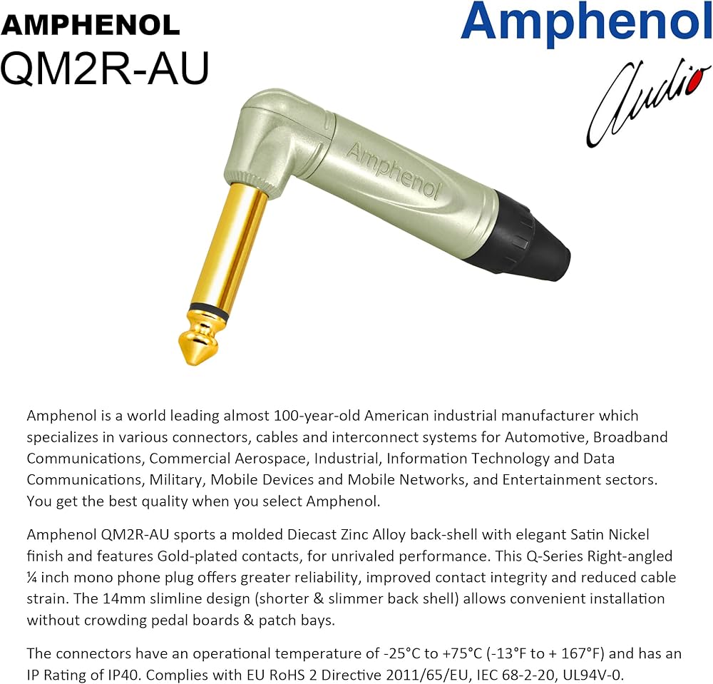 Amphenol QM2R-AU sports a molded metal back-shell with elegant Satin finish and features Gold-plated contacts, for unrivaled performance. This Q-Series Right-angled ¼ inch mono phone plug offers greater reliability, improved contact integrity and reduced cable strain. The slimline design (shorter & slimmer back shell) allows convenient installation without crowding pedal boards & patch bays.
