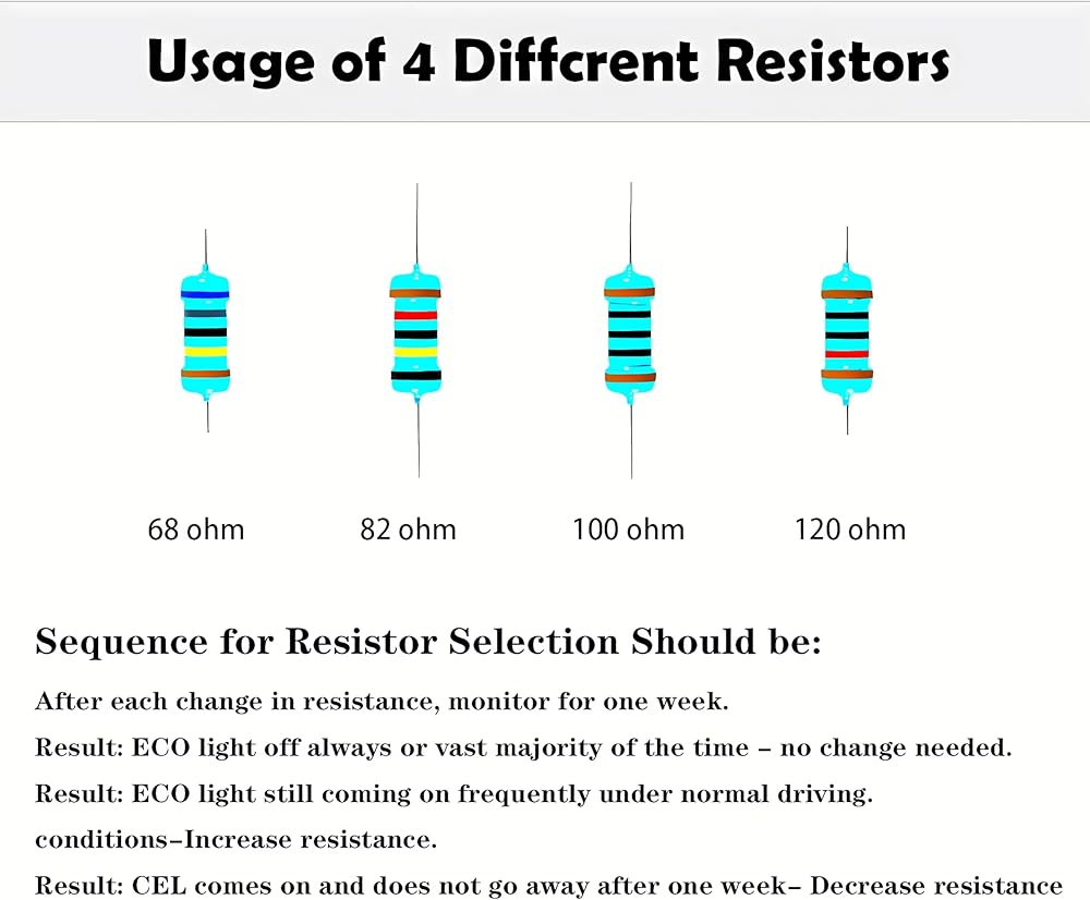 【ملاحظة: هناك 4 أنواع مختلفة من المقاومات، والتي تعمل في درجات حرارة مختلفة بسبب اختلاف مكونات نظام تبريد السيارة. ولذلك، فمن الضروري اختيار المقاوم المناسب وفقا لدرجة حرارة التشغيل. يوصى بالبدء بمقاومة 82 أوم ومراقبتها لمدة أسبوع واحد.