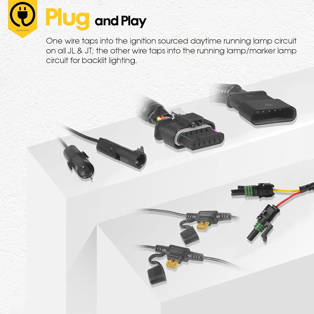 【Effortless Installation】: Come with Wiring Harness & Barrel Connectors. Use the Daytime Running Lamp Adapter Wiring Harness, you could easily connect additional daytime running (DRL) to your Wrangler JL JLU and Gladiator JT. Plug-and-play, one wire taps into the ignition sourced daytime running lamp circuit on all JL & JT. The other wire taps into the running lamp/marker lamp circuit for backlit lighting.