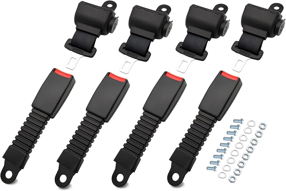 Golf Cart Seat Belts Kit,Universal Retractable Front Rear Golf Cart Seat Belt Kit Fitment: Universal retractable front rear golf cart seat belt kit is compatible with most golf cart such as EZGO TXT RXV, Yamaha, Club Car DS Precedent, Go Kart, UTV and more. Features: Golf cart seat belt is Retractable. Retractable length 42 inch long which can fit most users well. It's convenient and fast to adjust the length as you like. Golf cart seat belts can be mounted on the front or rear seat. The design of the seat belt is reasonable and user friendly.And it's easy to install. This seat belt set has four separate seat belts, which can be installed not only on 2 passengers golf carts, but also on 4 passengers golf carts, which can well protect each passenger. Security: This golf cart seat belts kit could provide adult and kids full safety protection on front seat or rear seat,especially when people encounter an emergency brake. Package Included: 4 pcs seat belts with buckles 4 set of installation screws gasket If you have any problems in the process of purchasing or using, please contact us by email, we will solve the problem for you in the first time.