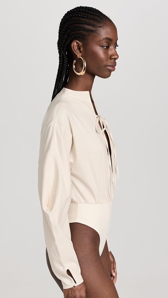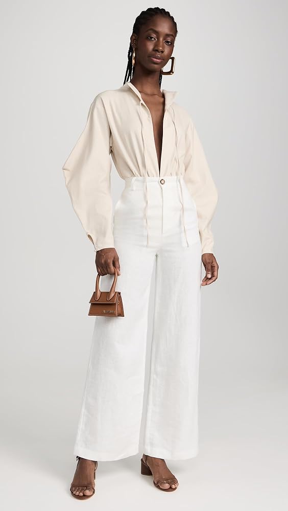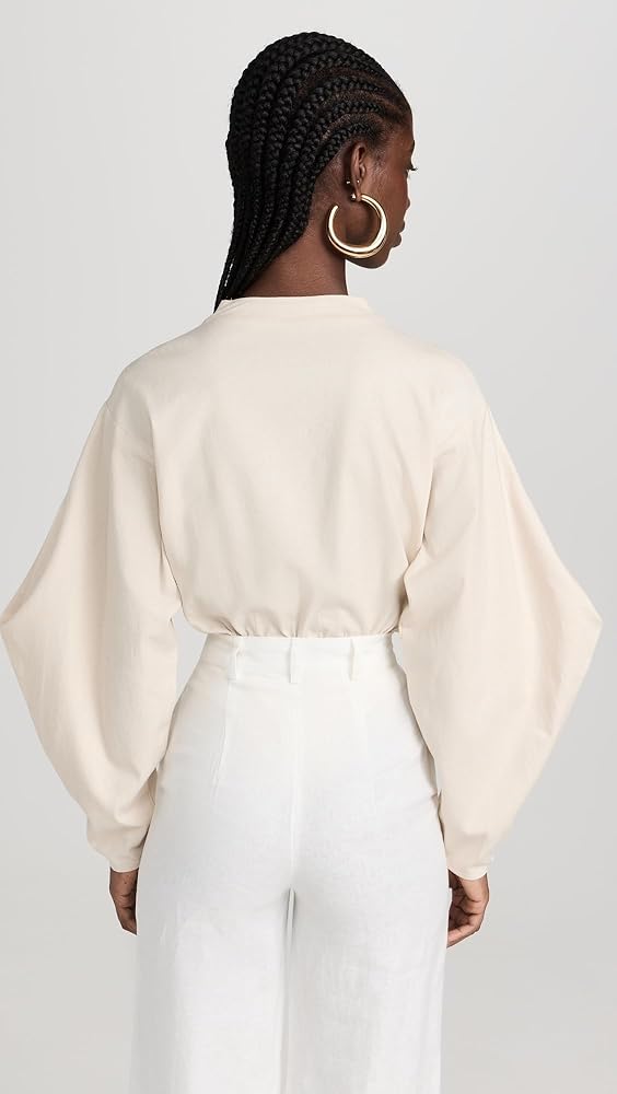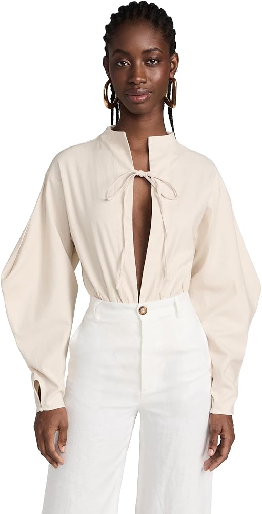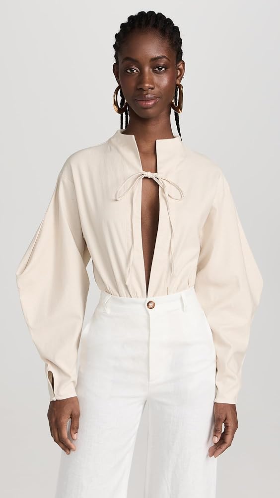 - خط عنق عميق مع فتحة مفتاح ربطة عنق، وأكمام طويلة بالون، ووصلة بإبزيم