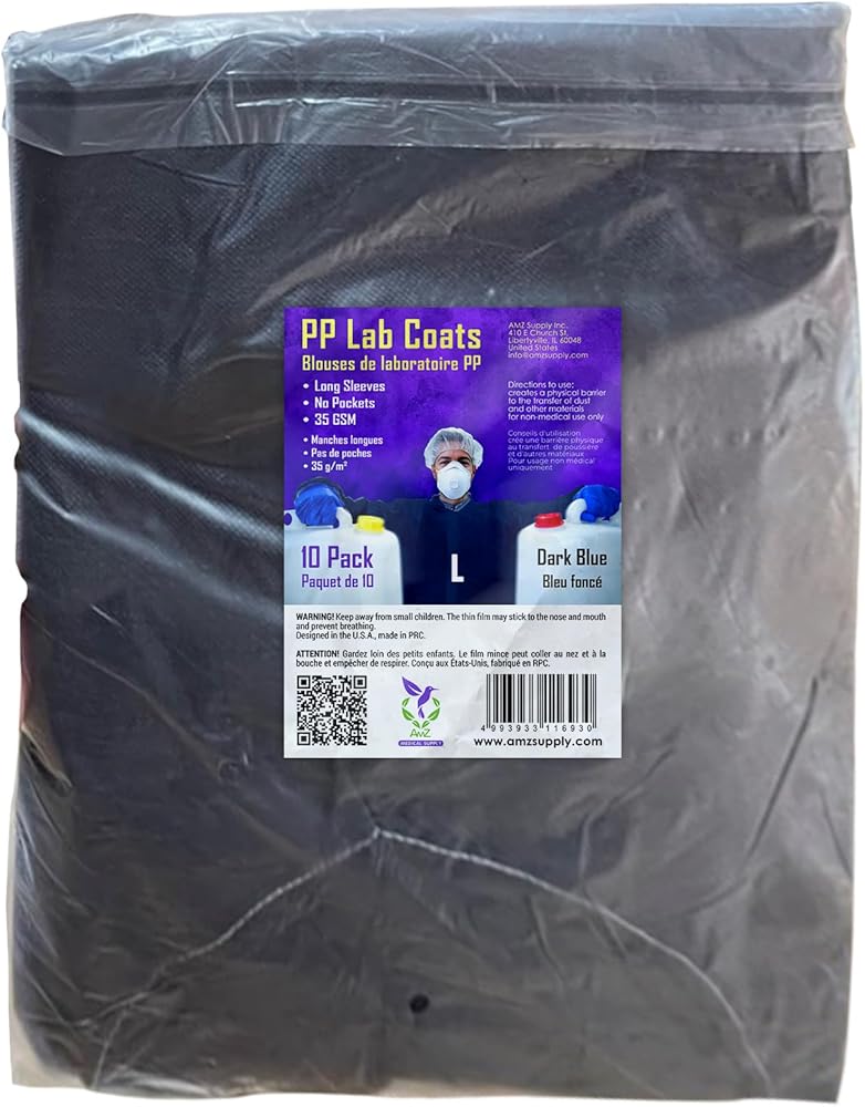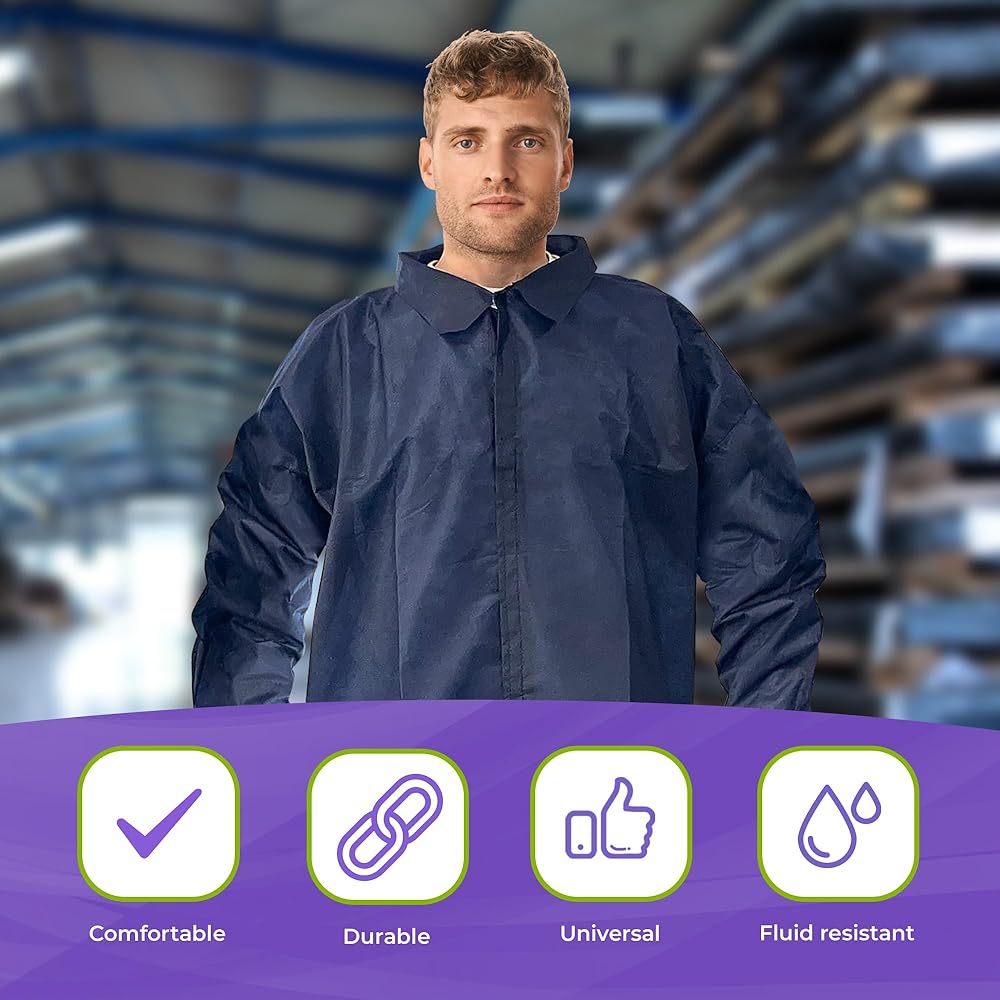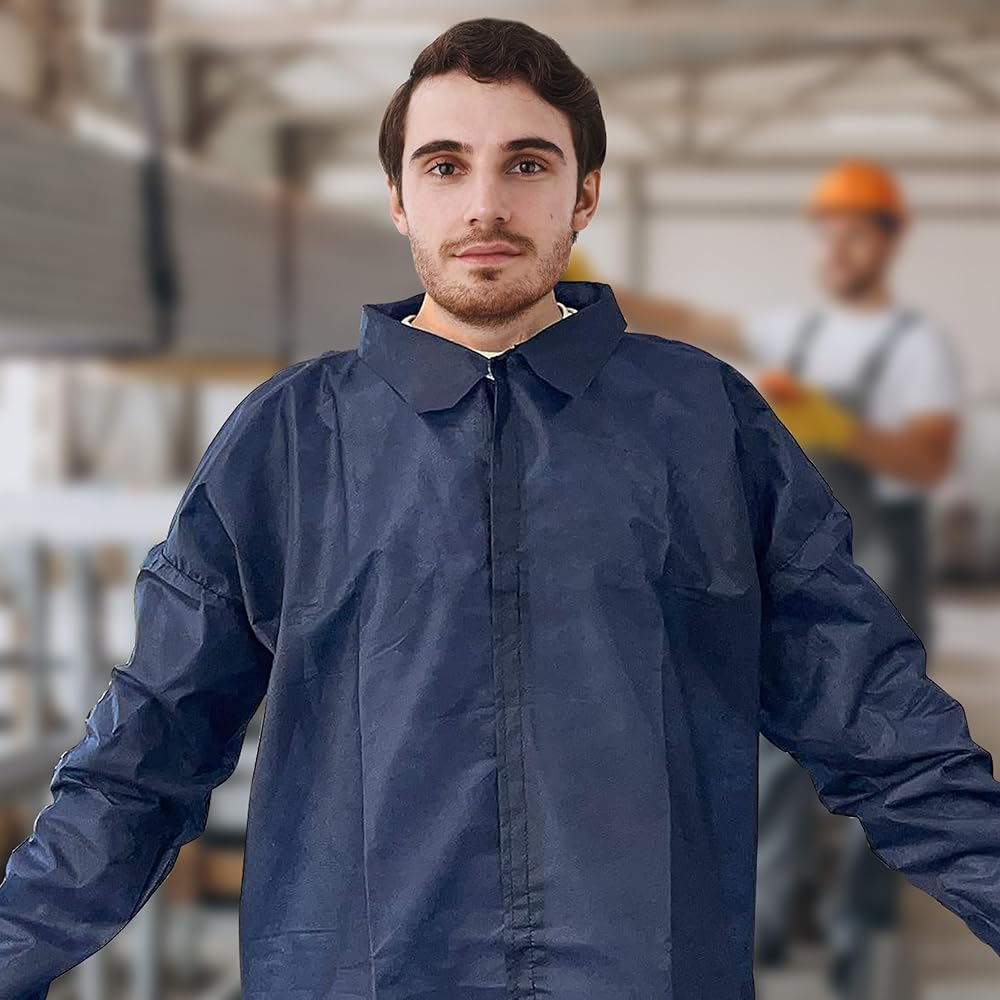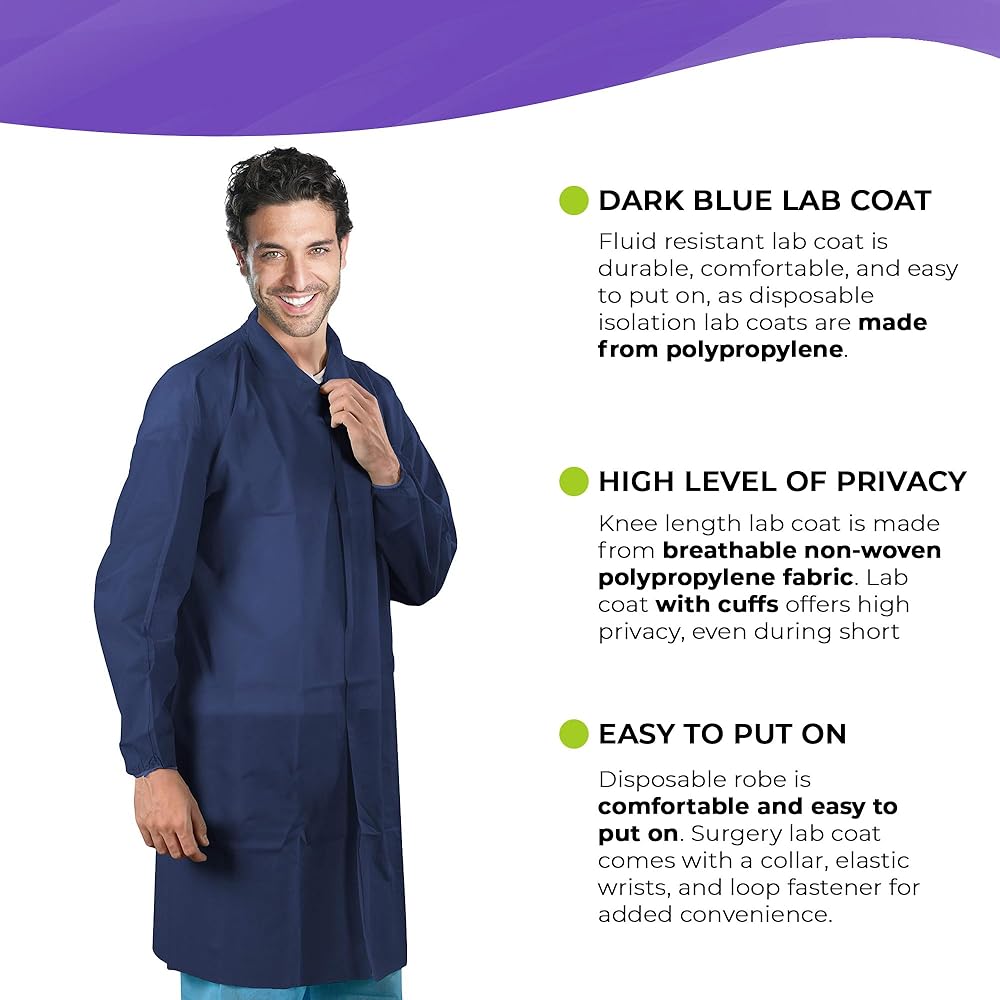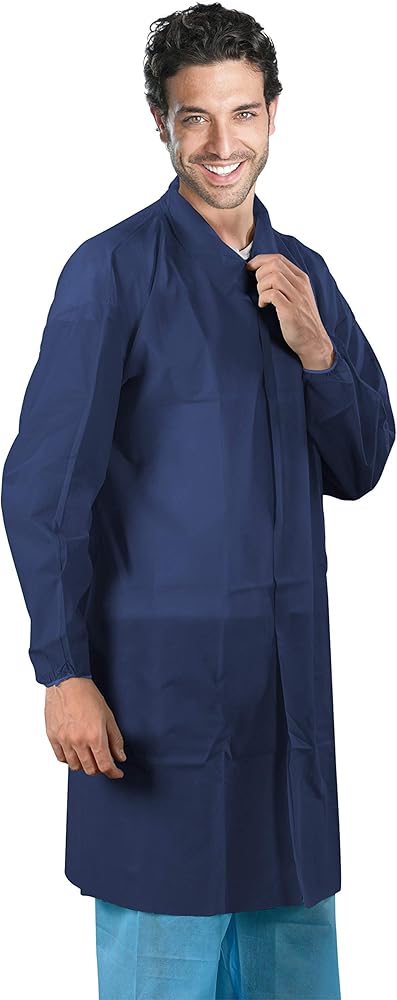 عبوة من 10 معاطف مختبر للاستعمال مرة واحدة باللون الأزرق الداكن، مقاس كبير. مصمم للرجال والنساء على حد سواء، معطف المختبر للبالغين واسع وسهل الارتداء. تضمن الطبيعة خفيفة الوزن لمعطف مختبر الأسنان ملاءمة مريحة ومثالية للعمل لساعات طويلة.