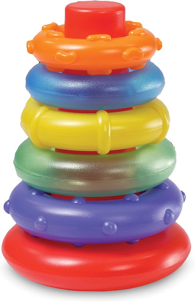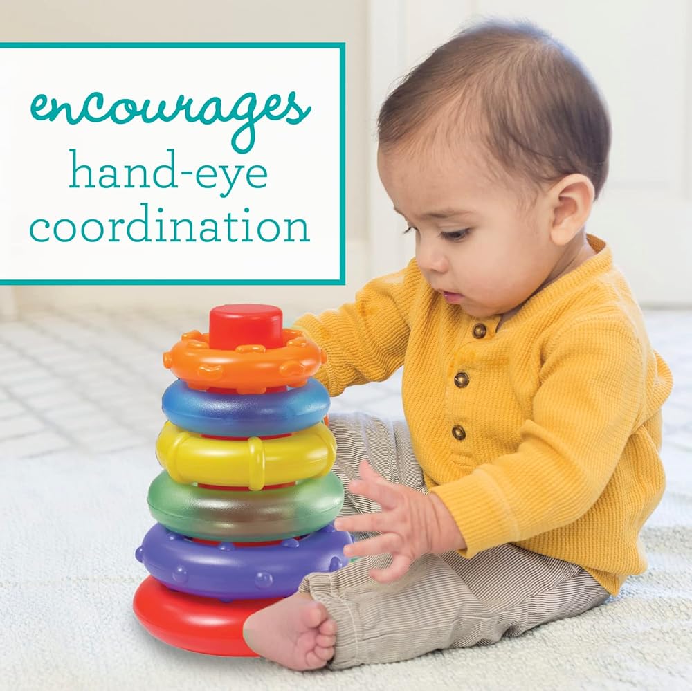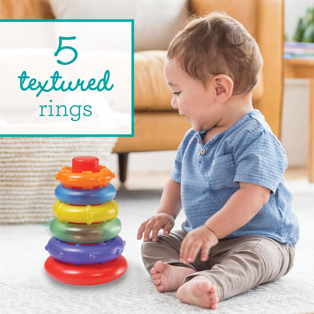 FIVE COLORFUL RINGS TO GRASP & STACK: With different textures, colors and sizes, these rings offer plenty of opportunities for learning and exploration