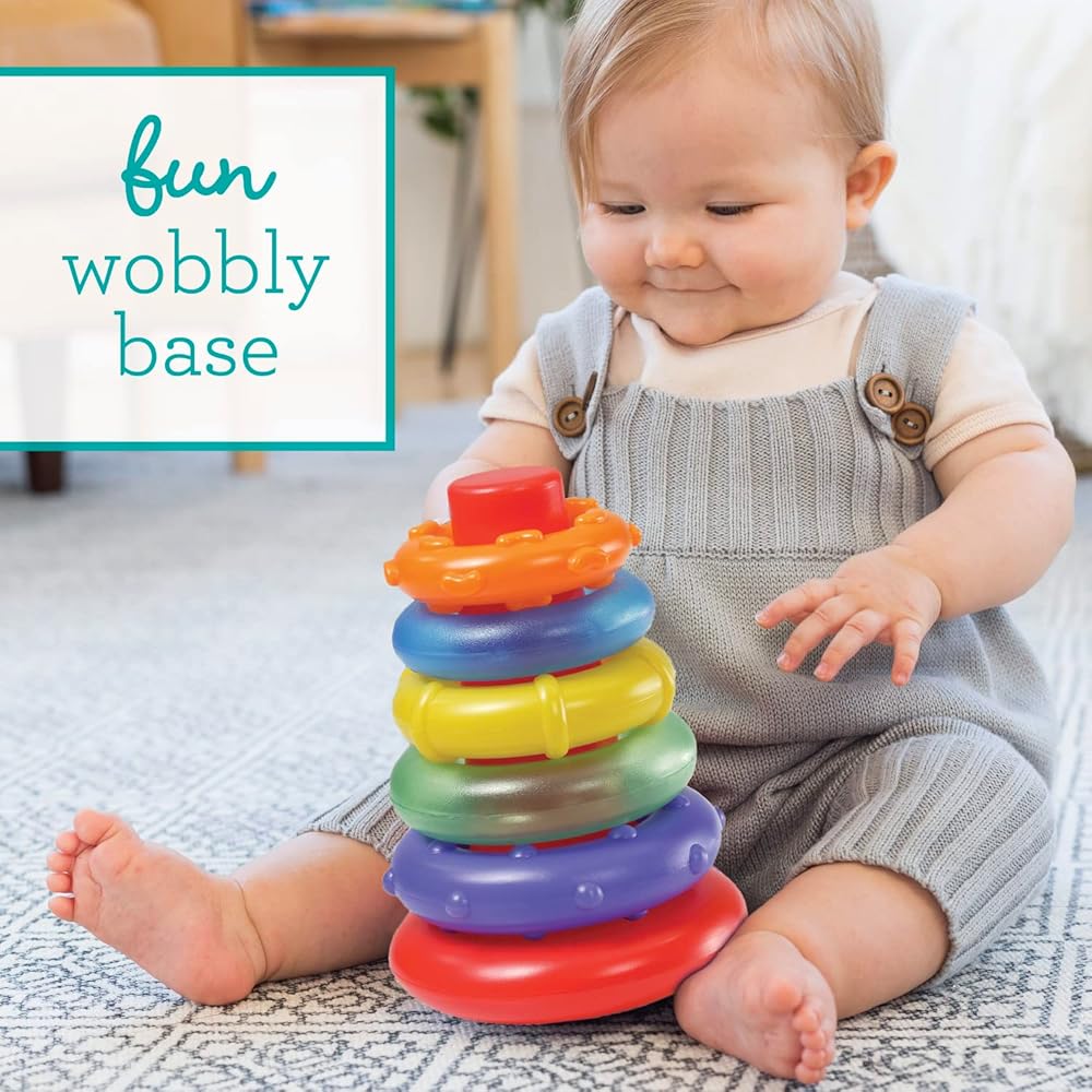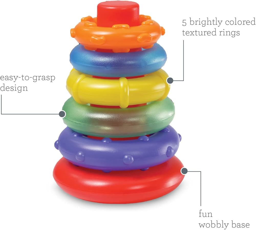 CLASSIC PLAY WITH A TWIST: This stacking game contains 5 brightly colored textured rings with a fun wobbly base. Rockin' Rings can be used for teaching stacking, sorting or just plain fun