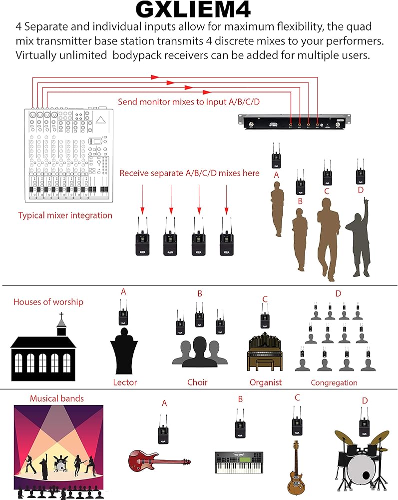يتوفر نظام GXLIEM Wireless IEM في 3 تكوينات. جهاز إرسال مزيج فردي، وجهاز إرسال مزيج مزدوج، ومحطة قاعدة إرسال مزيج رباعي تنقل عمليات مزج منفصلة إلى فناني الأداء. من خلال المراقبة اللانهائية لجهاز استقبال النظام المحمول، يعد هذا الحل هو الأكثر مرونة في الصناعة ومفيدًا عند إعداد عمليات مزج متعددة مع عدد كبير من أجهزة استقبال النظام المحمول. يساعد التصميم الرشيق لتردد الأنظمة في ضمان خطة قناة نظيفة وواضحة. بالإضافة إلى ذلك، يحتوي جهاز الاستقبال المحمول على شاشة عرض عالية التباين تتميز بمؤشر عمر البطارية. يتم تزويد جهاز الاستقبال المحمول بسماعات أذن MEB1 عالية الأداء. يتم تزويد جهاز الإرسال المعدني القوي القابل للتركيب على حامل بأذنين حامل وهوائي نصف موجة. يتم تزويد الأنظمة بكمية متساوية من أجهزة الاستقبال المحمولة على أجهزة الإرسال.