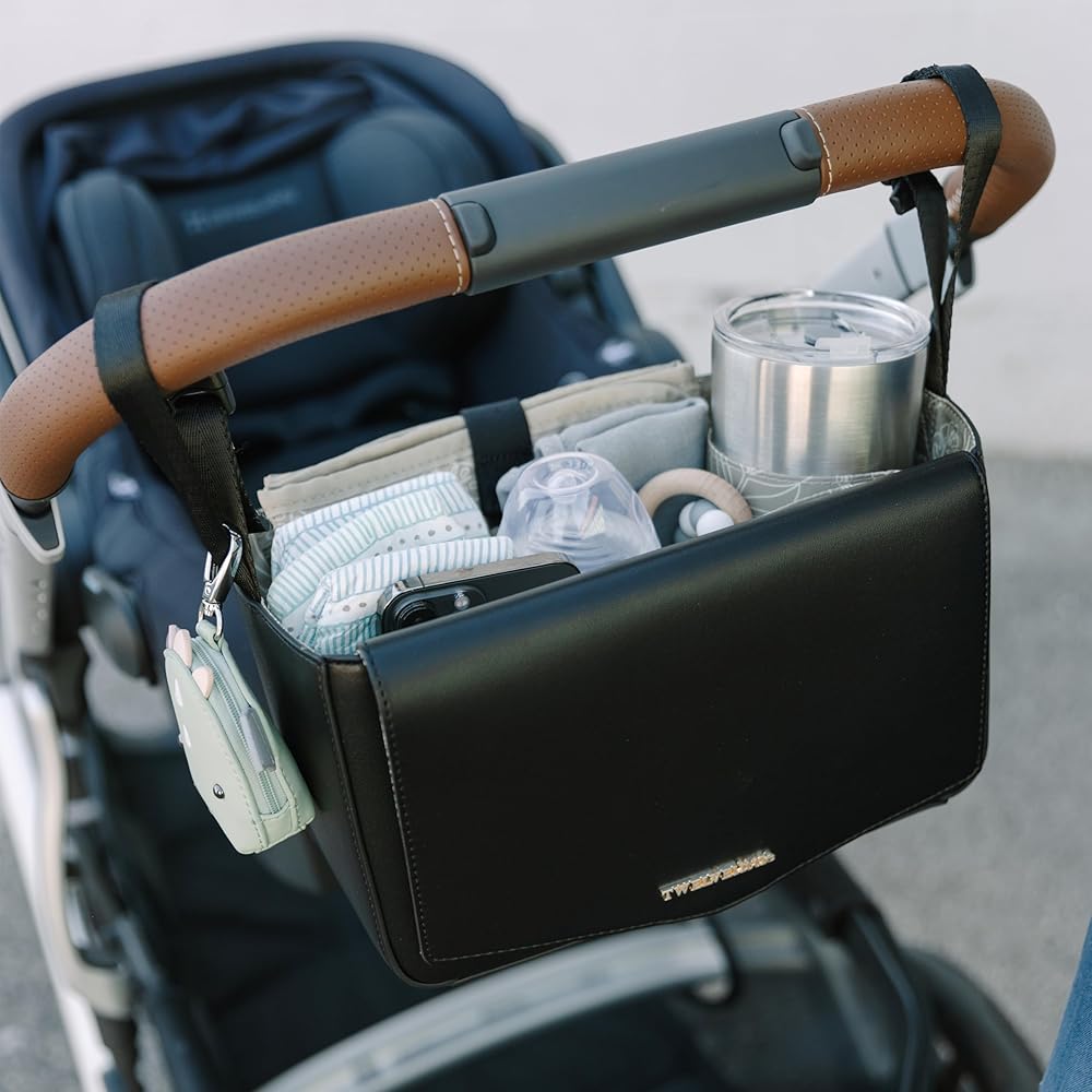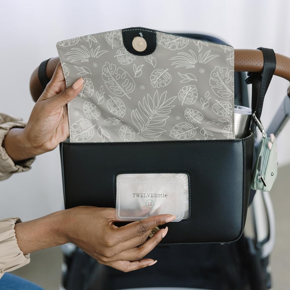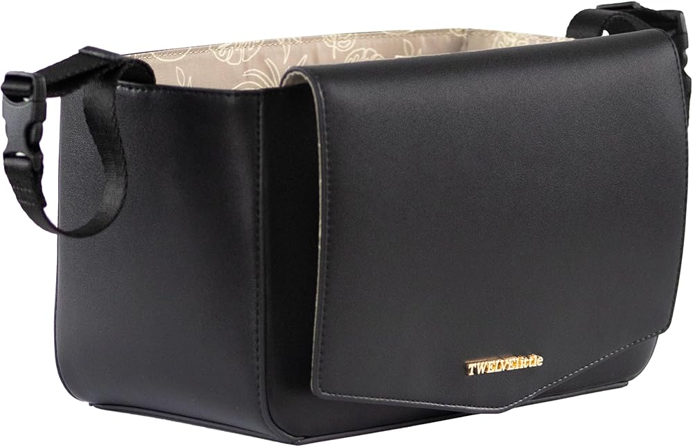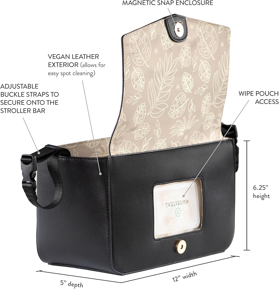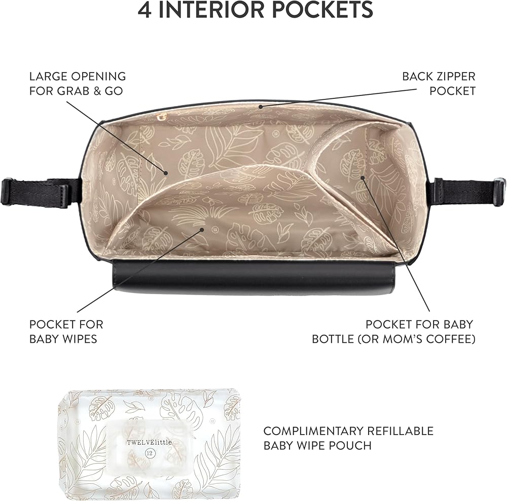 TWELVElittle Stroller Organizer Peek A Boo Stroller Caddy 2.0، علبة سفر مع علبة مناديل من الجلد النباتي، أسود