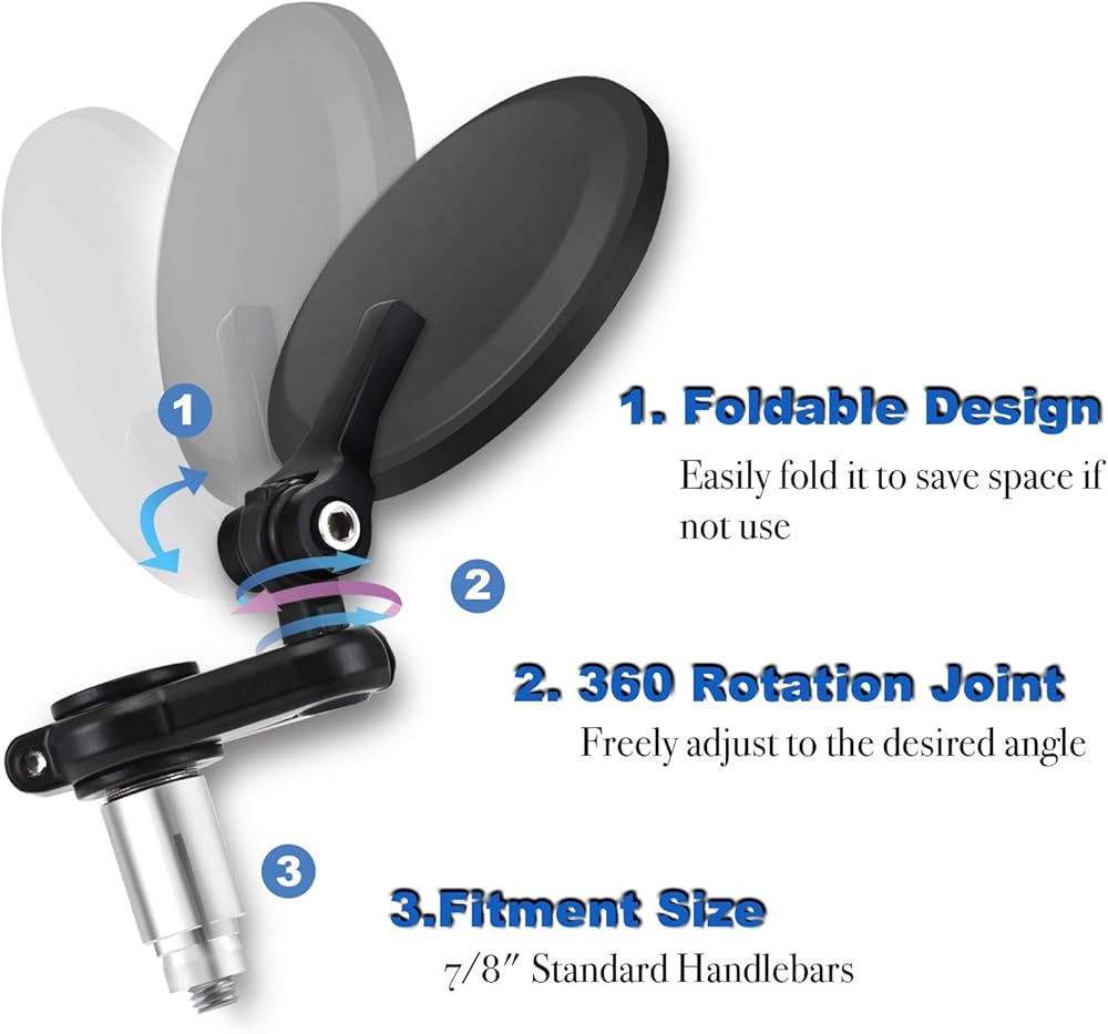 FULLY ADJUSTABLE - Design of Ball-type connection joint and foldable holder, this round style bar end mirror can be 360 degrees rotated and freely adjusted up & down or sideway for the best viewing angle