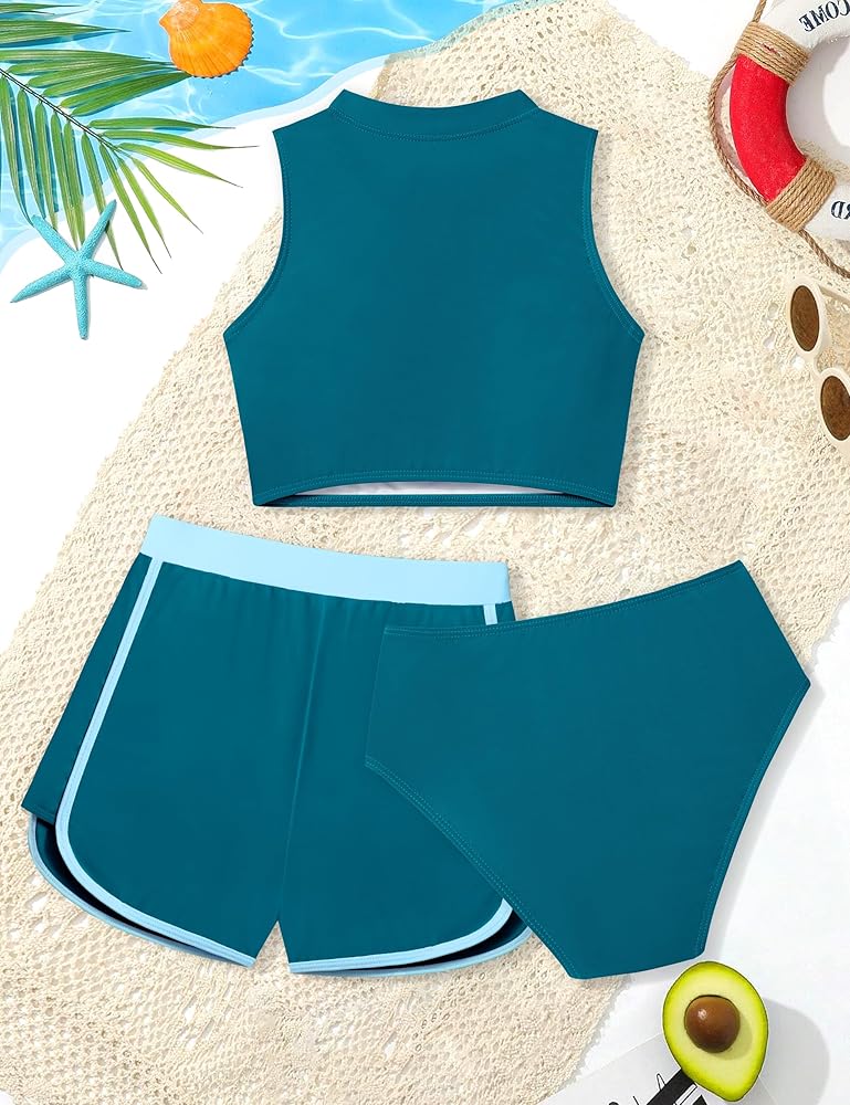 ملابس سباحة للفتيات مقاس 7 إلى 8 بدلة استحمام للبنات مجموعة بيكيني بسحاب أمامي مع شورت 3 قطع ملابس سباحة للفتيات بدلات استحمام رياضية للفتيات أزرق وأخضر