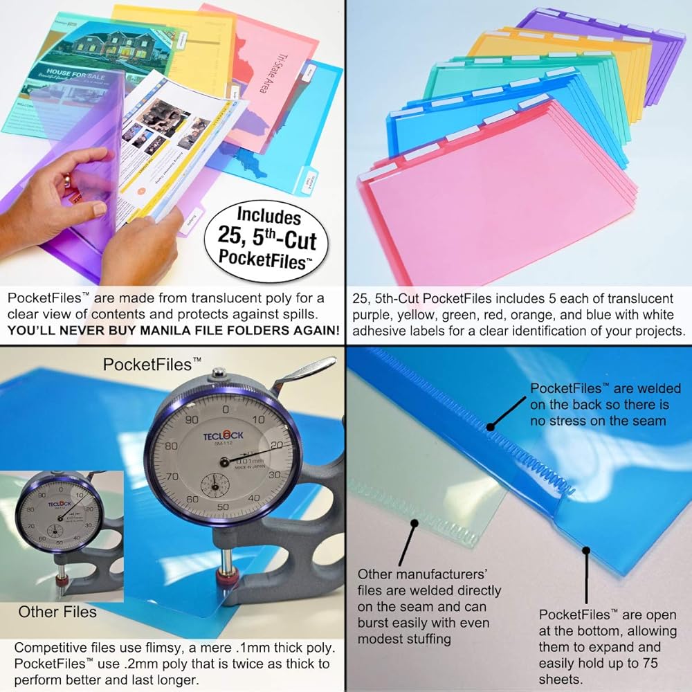 تحديد سريع للملف - تأتي ملفات الجيب ذات القطع الخامس المتضمنة بألوان متنوعة وشفافة توفر رؤية واضحة لمحتويات الملف للتعرف السريع على الملف: 5 لكل من الأحمر والأزرق والأخضر والأرجواني والبرتقالي. يتم إغلاق ملفات الجيب على الجانبين لمزيد من الأمان وسهولة التحميل ولحماية المواد من السقوط.