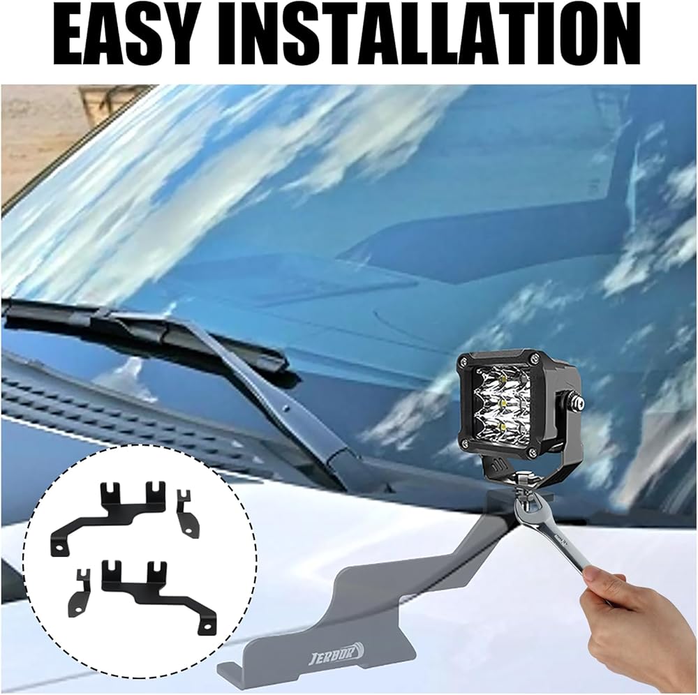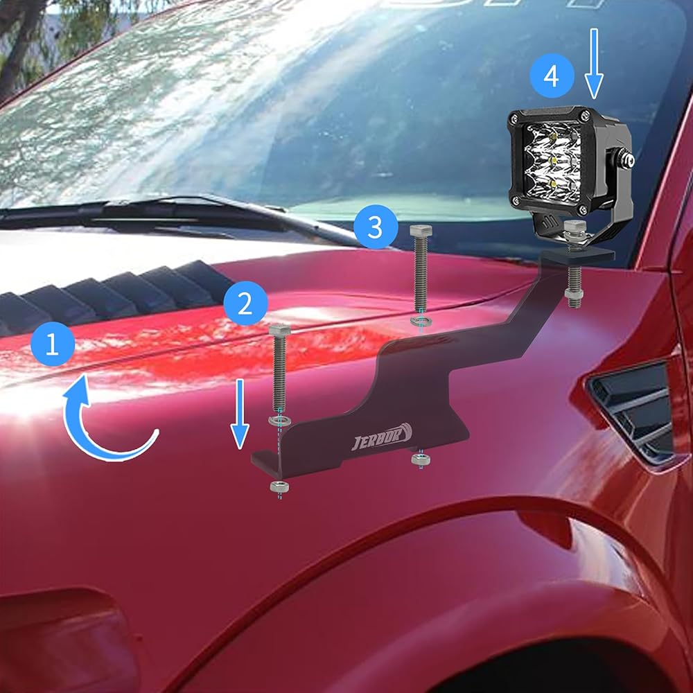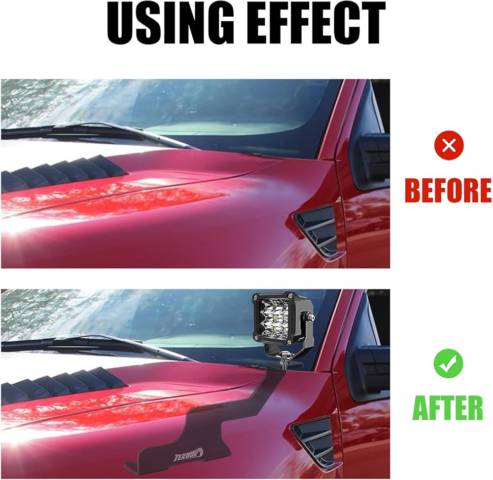 【🚗لا توجد حفر وسهلة التركيب】سهلة التركيب على مفصلات غطاء الرأس. لا تتداخل دعامات تثبيت حامل الضوء مع وظيفة فتح الغطاء أو إغلاقه. يتم تركيبه على فتحات مسامير المصنع ولا يتطلب أي حفر، ويتوافق بشكل مثالي مع غطاء المحرك.