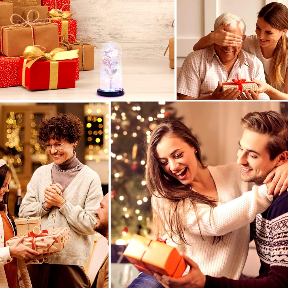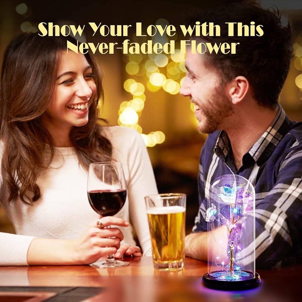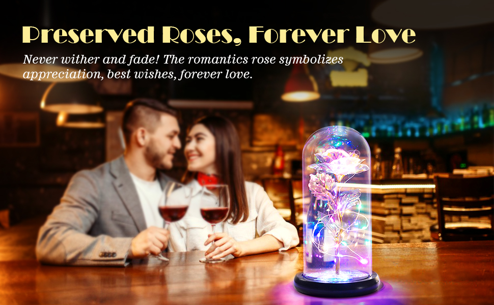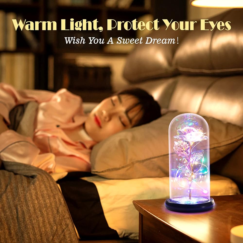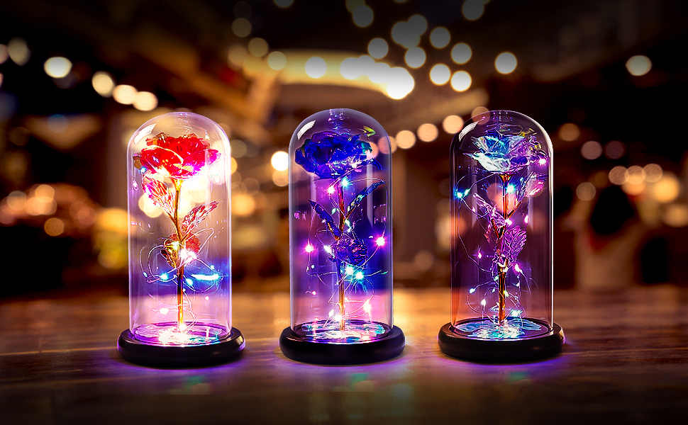 [أضواء LED وردية ملونة للأم والصديقة والأم والنساء والفتيات] يتم لف الوردة في القبة الزجاجية حول أضواء شريط LED ملونة، والتي تضيء القبة الداخلية وتضيء المناطق المحيطة أيضًا. المجرة روز مدعومة بـ 3 طاقة AAA (غير متضمنة) والمفتاح موجود أسفل القاعدة الخشبية لجعلها أكثر أمانًا ومتانة ومقاومة للحرارة.