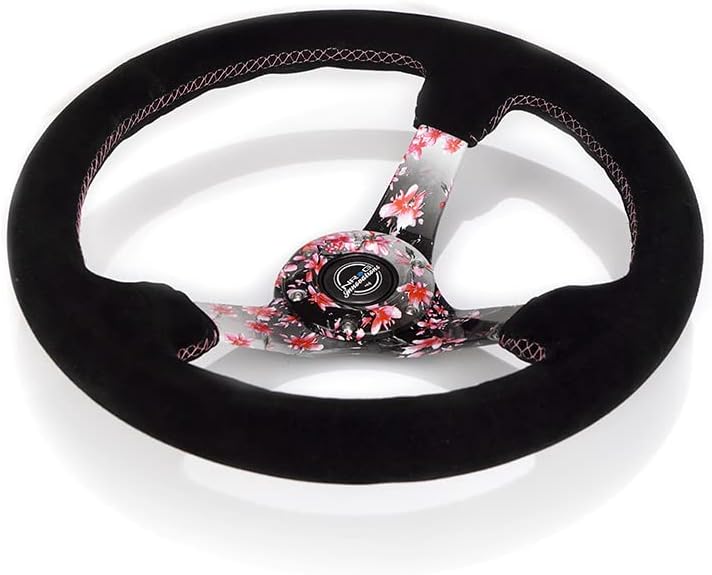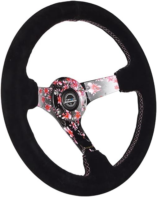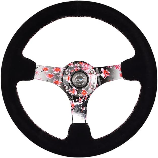 NRG Innovations NRG-RST-036SAK-S عجلة قيادة معززة بزهور ساكورا مغمورة بالماء بعمق 3 بوصات، 5 مم، 350 مم، جلد سويدي وردي مع خياطة بيسبول سوداء