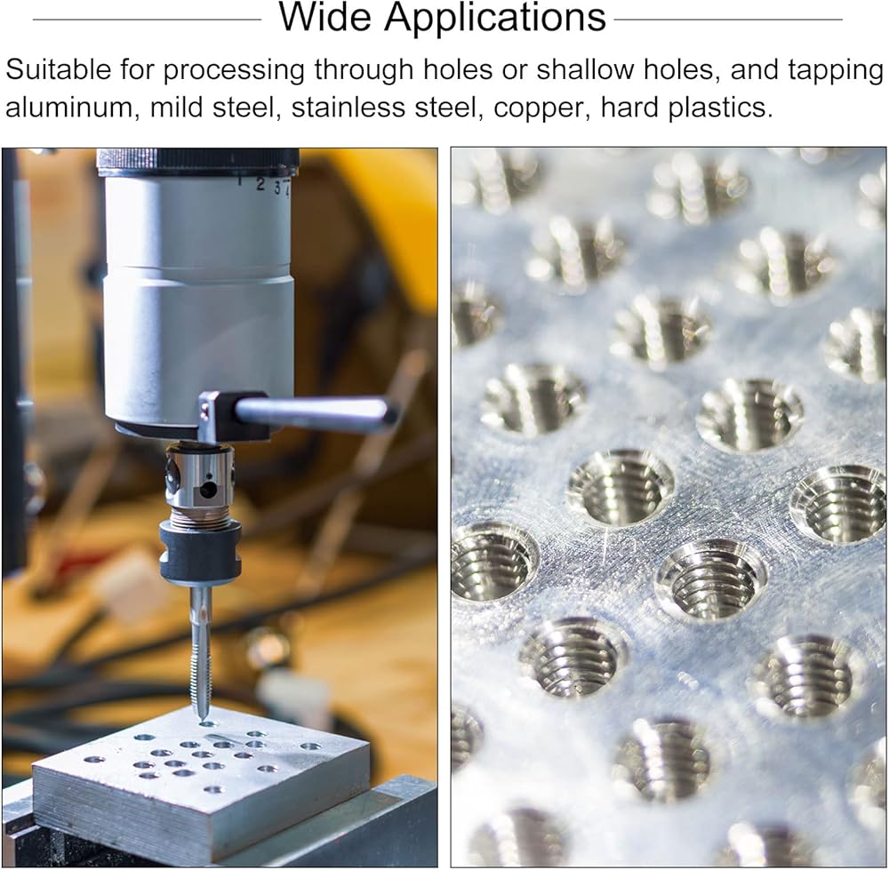 • Thread Tap: Straight flute design, downward chip removal, fast tapping with accuracy. Suitable for processing through holes or shallow holes. For tapping aluminum, die steel, stainless steel, bronze, hard plastics. Provides high hardness and toughness for wear resistance.