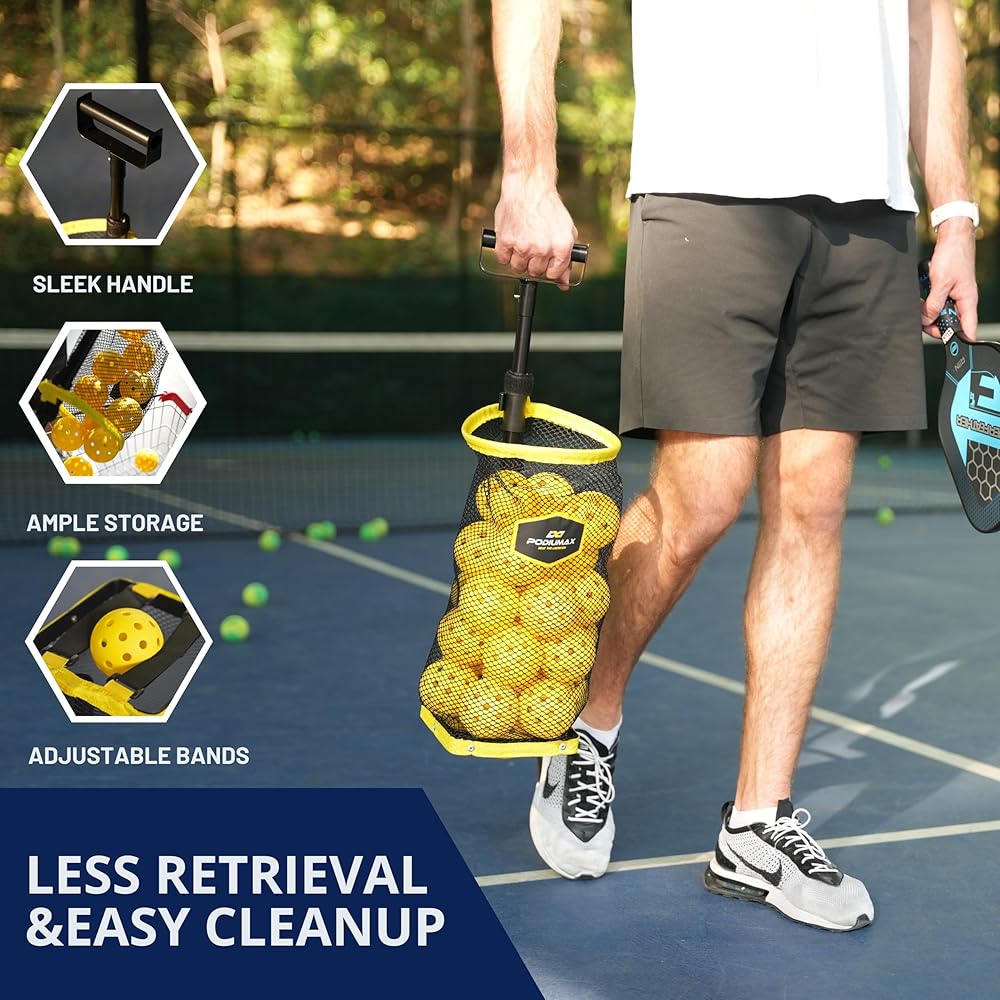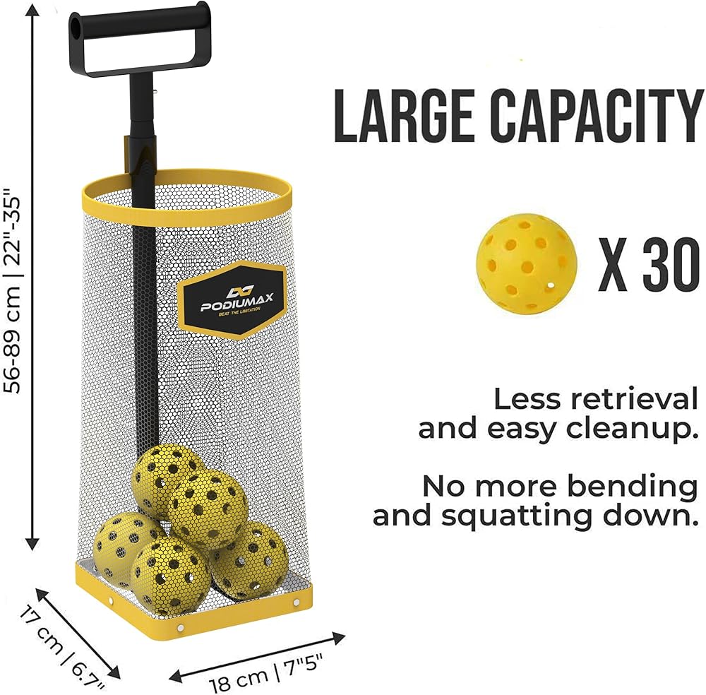 تصميم يدوي - يتميز جامع الكرات PodiuMax بتصميم مقبض أنيق يوفر راحة معززة في الإمساك. كل ما عليك فعله هو دحرجة المجمع فوق كرات المخلل، وسوف تدخل مباشرة إلى الحاوية.