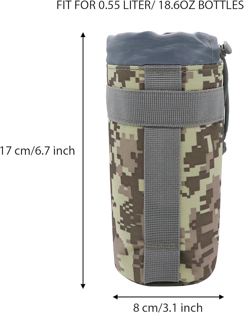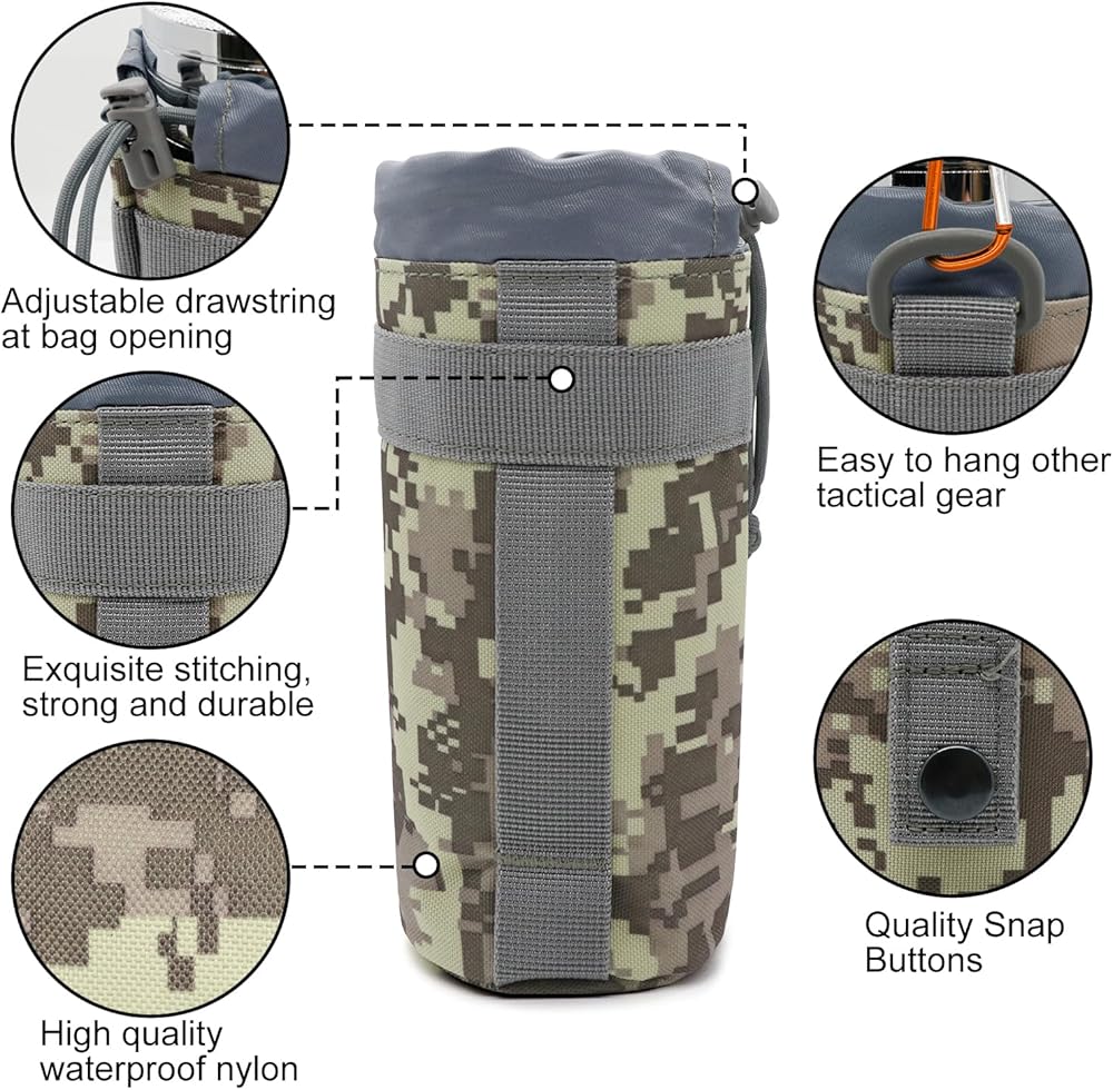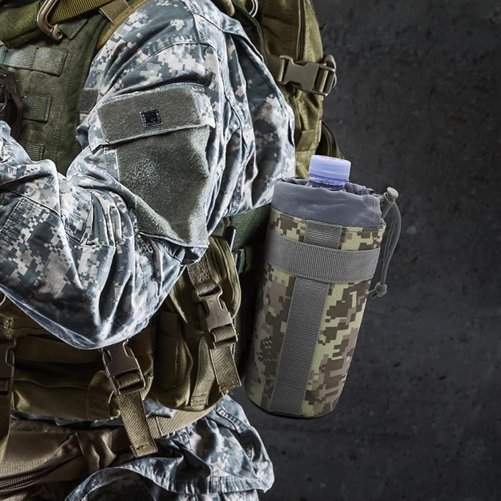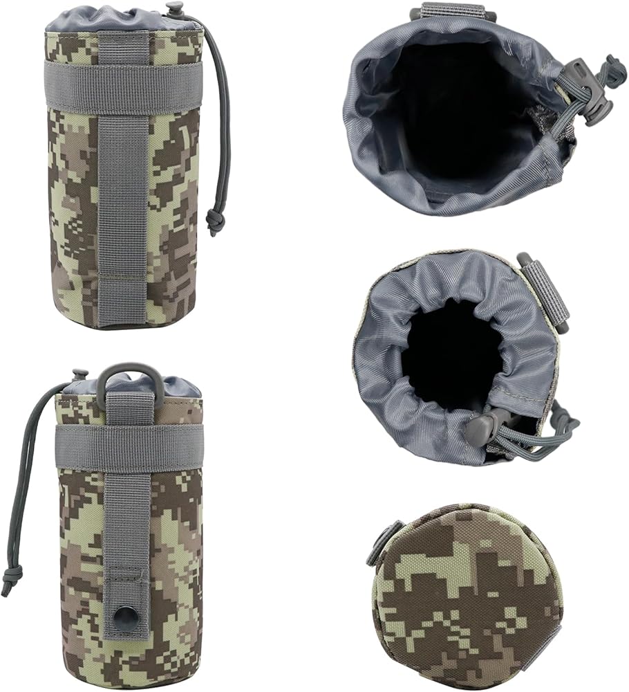- Crafted from high-quality materials, this water bottle pouch is built to withstand rugged environments and harsh conditions. Molle water bottle pouch sports drawstring design ensures a snug fit for water bottles, preventing any accidental spills or damage