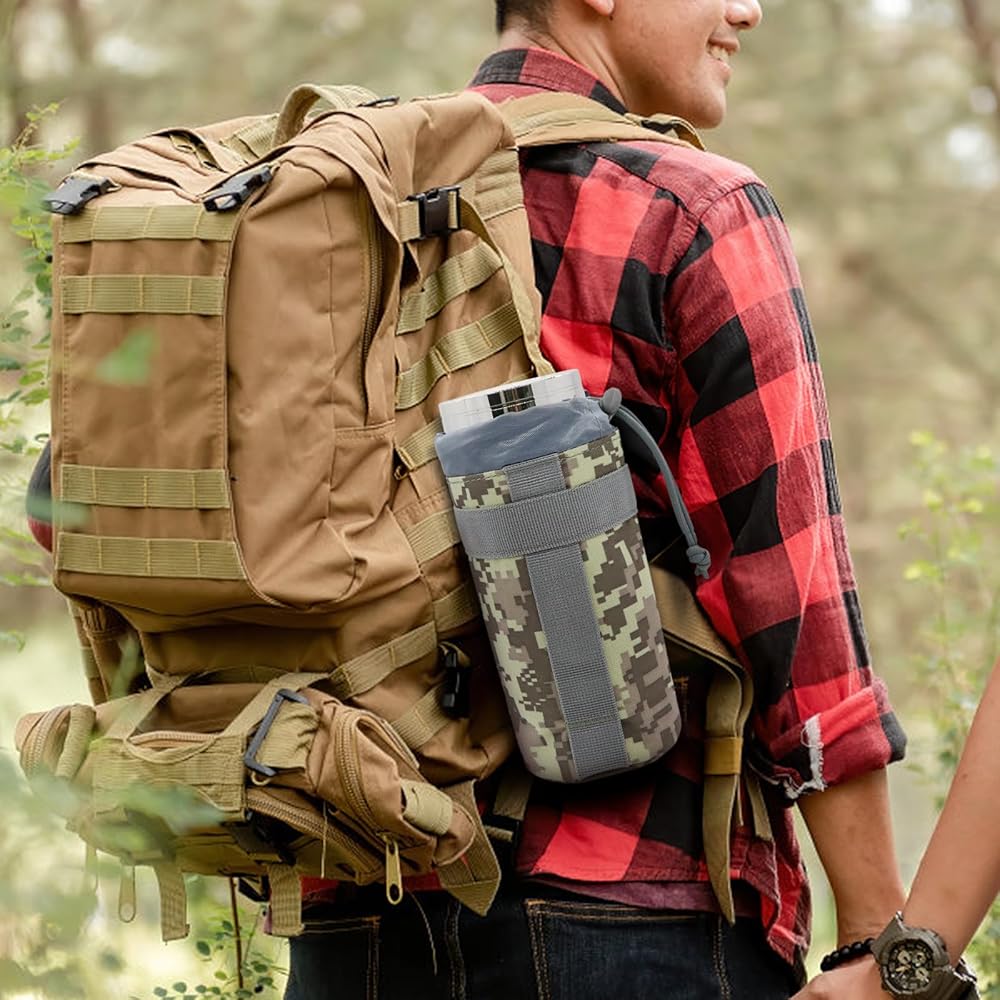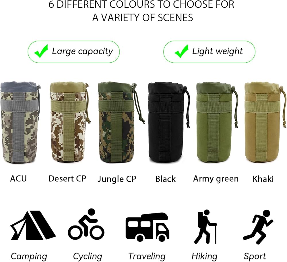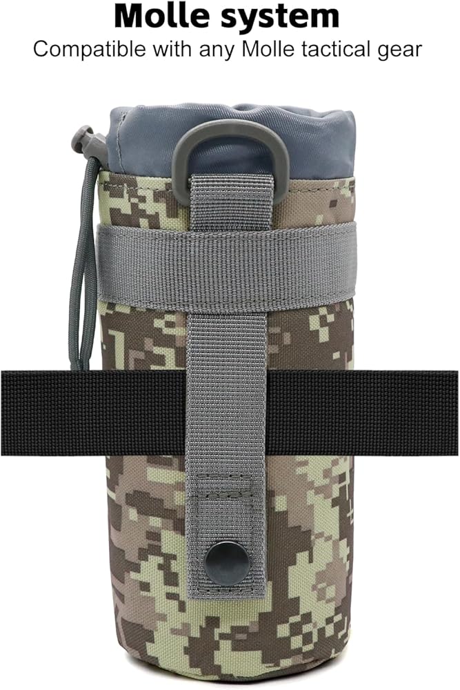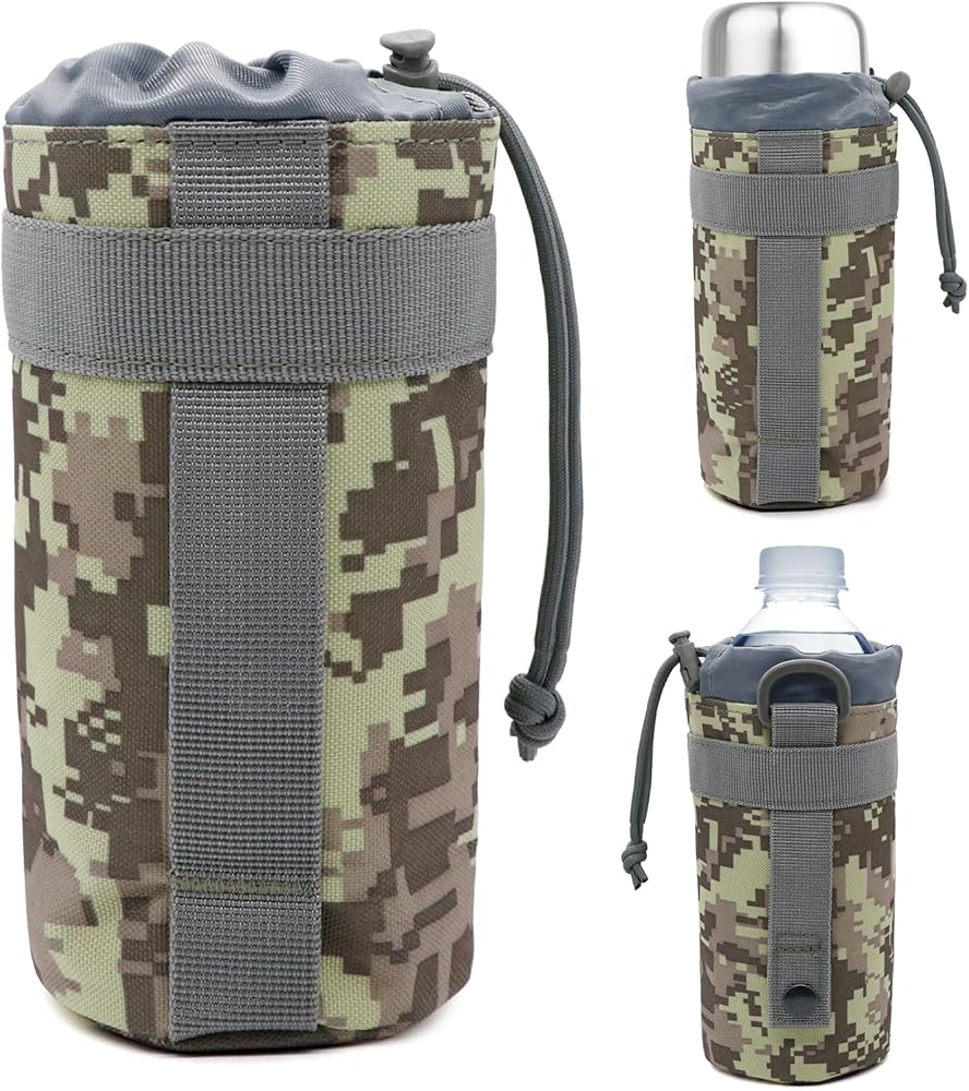 - Crafted from high-quality materials, this water bottle pouch is built to withstand rugged environments and harsh conditions. Molle water bottle pouch sports drawstring design ensures a snug fit for water bottles, preventing any accidental spills or damage