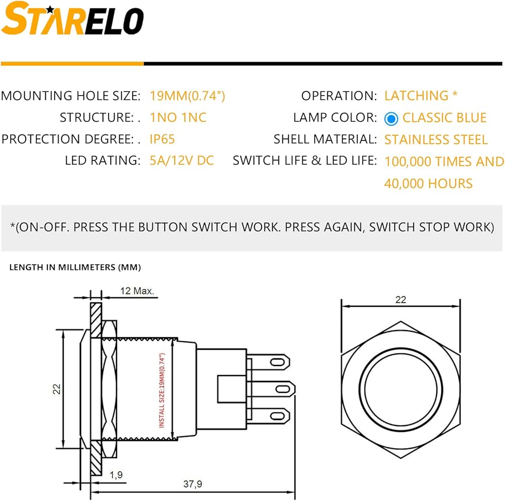 حجم فتحة التركيب: 19 ملم، تصنيف LED: 12 فولت 10 أمبير تيار مستمر. التصميم عالي الجودة يجعل المنتج يتحمل تيارًا أكبر، مما يجعل عملك أكثر أمانًا.