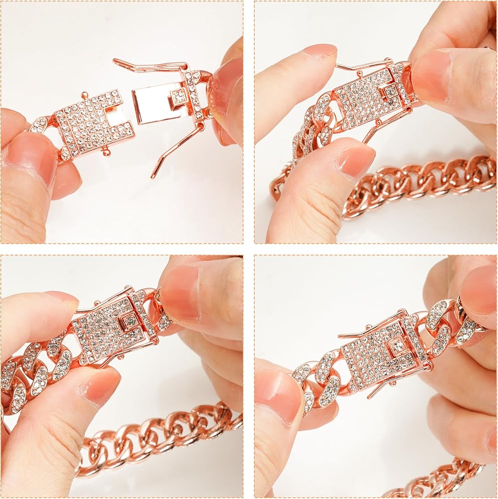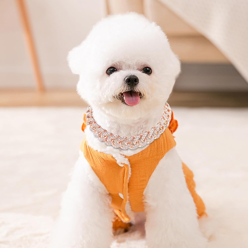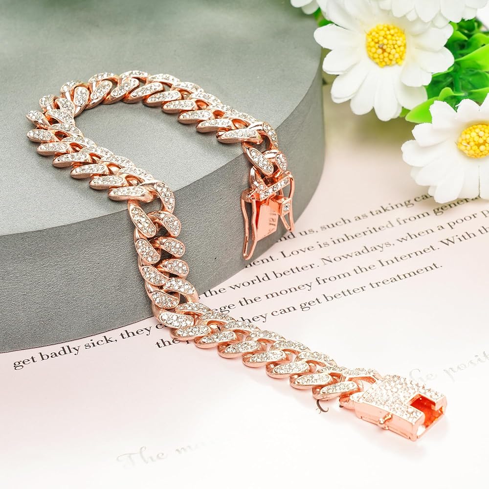 Lystaii سلسلة الكلب الكوبية الماس الارتباط روز الذهب الوردي كريستال طوق مجوهرات اكسسوارات الحيوانات الأليفة قلادة مع تصميم طوق معدني المشي مشبك آمن للكلاب والقطط (10 بوصة)