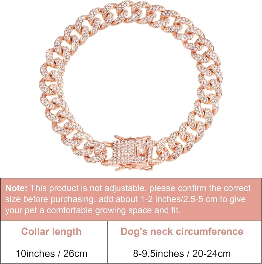 حجم قلادة الكلب الكوبية الذهبية الوردية: تم تصميم طوق الكلب الرائع هذا باللون الذهبي الوردي كقلادة غير قابلة للتعديل لقطتك أو جروك المحبوب. عرض القلادة الكريستالية الوردية 0.47 بوصة/1.2 سم، الطول 10 بوصات/26 سم، مناسب لمعظم الكلاب أو القطط. 10 بوصات مناسبة للكلاب أو القطط الصغيرة، يمكنك أولاً قياس محيط رقبة كلبك.