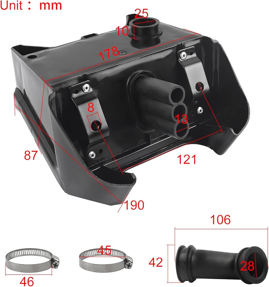 - تشتمل المجموعة على مجموعة صندوق الهواء، وحذاء مطاطي، ومشبك، وفلتر هواء رغوي.