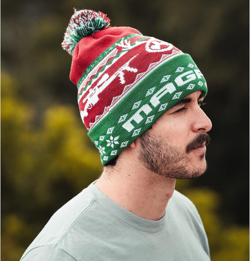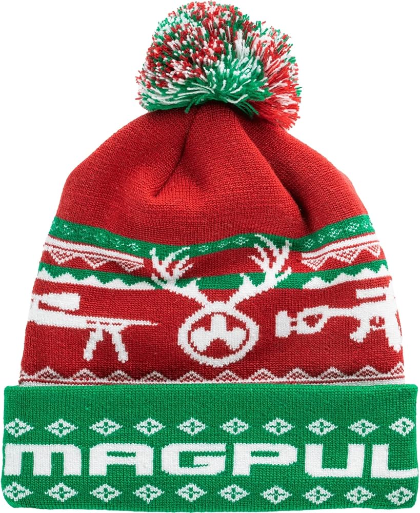 A winter warmer with special Magpul Christmas pattern. Its lightweight and quick-drying acrylic knit construction is made with little added stretch for extra comfort. 95% Acrylic Lycra. Pompom ball on top. Darted closure on top of crown. Branding is knit through-out. One size fits most.