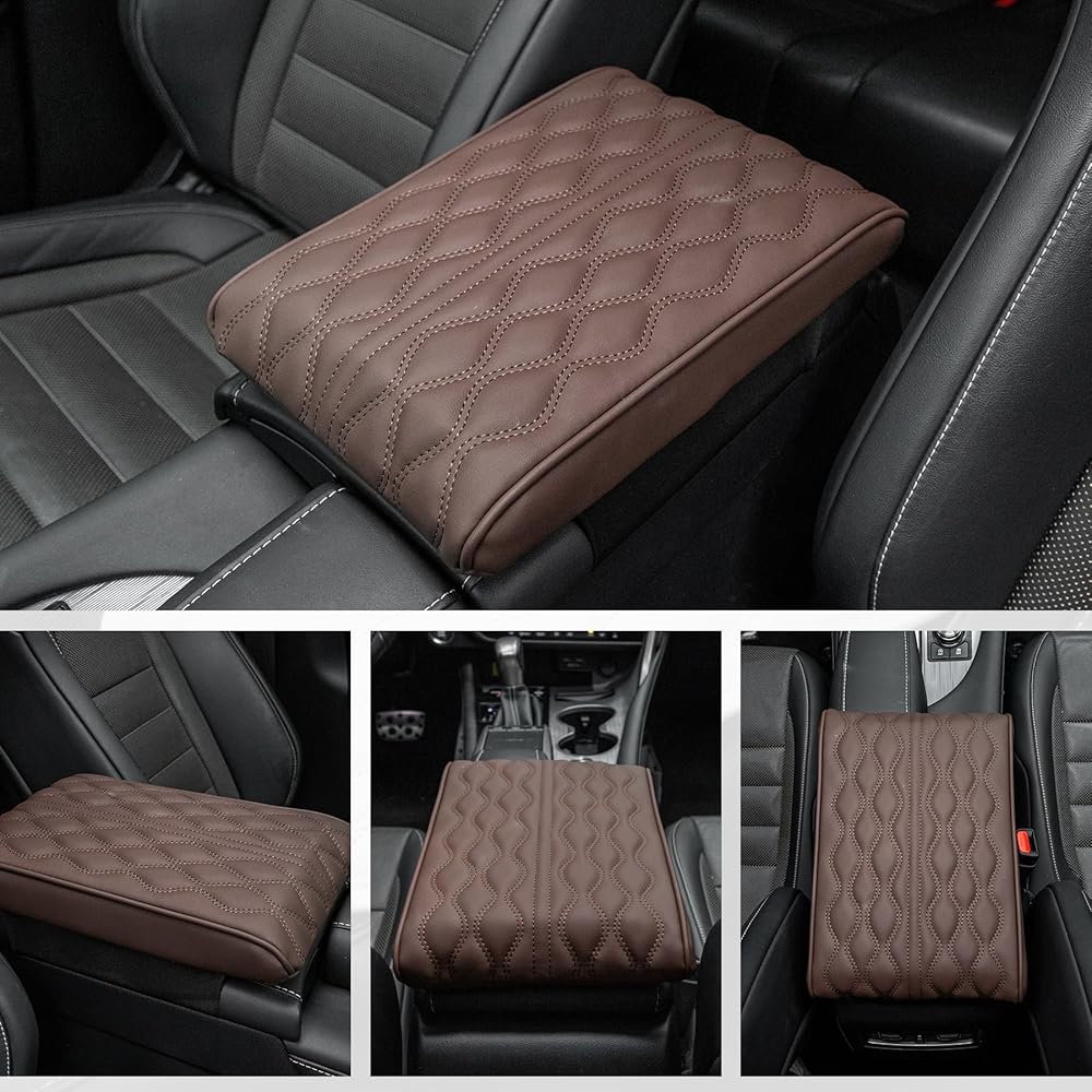 وسادة صندوق مسند ذراع السيارة الجلدية من Amiss، غطاء وحدة تحكم مركزية للسيارة مقاوم للماء، ملحقات وسادة مسند ذراع السيارة حماية داخلية لمعظم المركبات وسيارات الدفع الرباعي والشاحنات والسيارات (بني)
