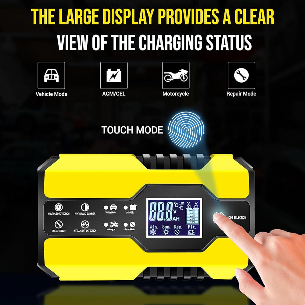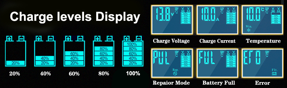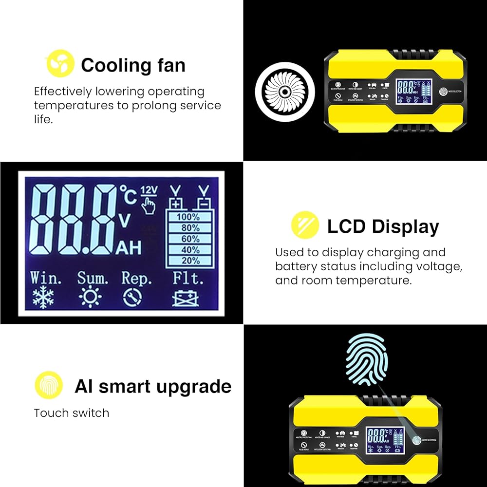 • تصميم مبتكر يعمل باللمس: يتميز بعناصر تصميم سهلة الاستخدام، مثل شاشة رقمية سهلة القراءة وأزرار اختيار الوضع ومؤشرات واضحة. احصل على جميع المعلومات في لمحة سريعة من خلال شاشة LCD الكبيرة. يُظهر مراقبة في الوقت الفعلي للتيار والجهد والطاقة ودرجة الحرارة الداخلية ونسبة الشحن وأوضاع الصيف/الشتاء. لا مزيد من الخطوات المعقدة - ما عليك سوى التوصيل واللمس لتحديد الوضع، ويتم الآن شحن البطارية! يضمن تشغيلًا خاليًا من المتاعب للمستخدمين من جميع مستويات الخبرة.
