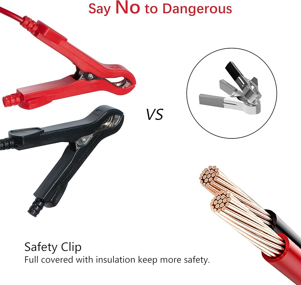 • ضمان السلامة القصوى: السلامة أولاً! يتميز شاحن بطارية السيارة الخاص بنا بغطاء ABS مقاوم للهب لمقاومة الحريق والصدمات. مع حماية الدائرة المدمجة، توفر شاحن البطاريات الخاص بنا حماية متعددة: حماية الجهد الزائد، حماية الاتصال العكسي (يتم توصيل الأقطاب الموجبة والسالبة بشكل غير صحيح)، حماية الدائرة القصيرة، الحماية من التيار الزائد، الحماية من الحرارة الزائدة، الحماية من الحرارة المنخفضة، حماية الجهد.