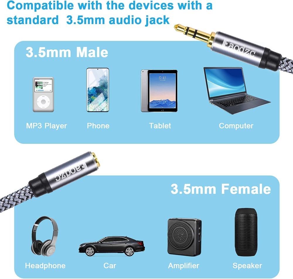 Faodzc 3.5mm Male to Female Cable Works fabulously to Connect all of your 3.5mm Devices, Giving you the Flexibility you Need for your Listening Pleasure.