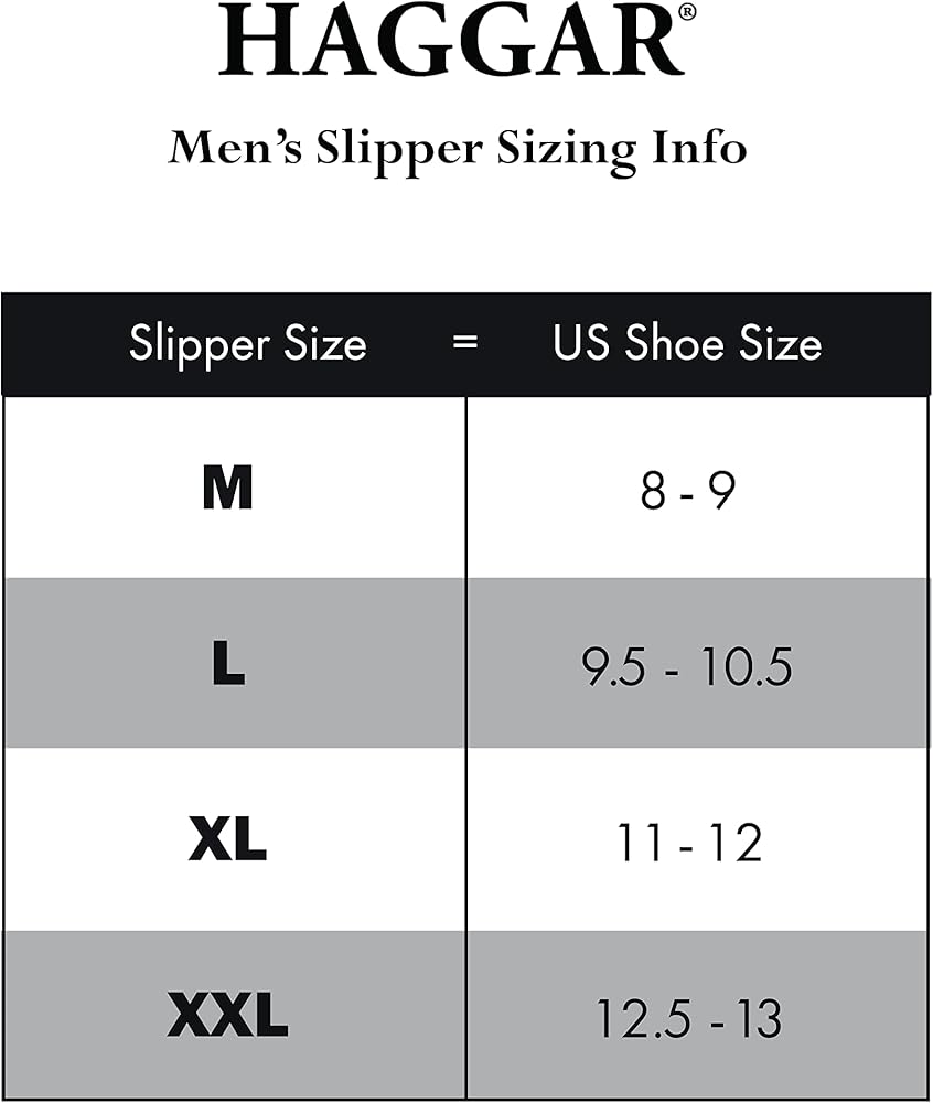 COMFORTABLE FIT: Find your snug slipper fit with our easy size guide. Choose from men's standard US shoe sizes M-XXL. Size equivalents are as follows: Medium (8-9), Large (9-10), X-Large (11-12), XX-Large (12-13). Whether you prefer a loose or tight fit, select the perfect pair of Haggar house shoes for your needs.