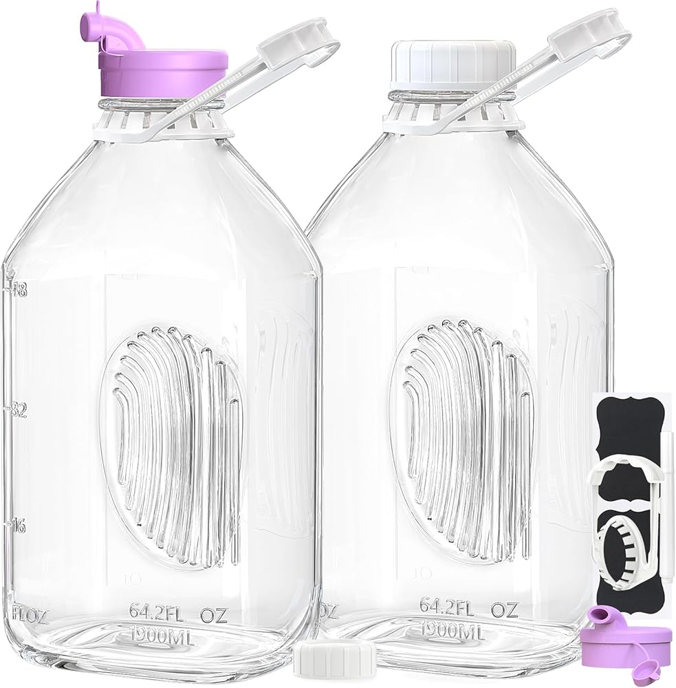 [حجم مثالي] - البرطمانات الزجاجية ذات الأغطية مصنوعة من مواد عالية الجودة، صحية، لا طعم لها، وخالية من البيسفينول بنسبة 100%، كل زجاجة عصير بسعة نصف جالون (أو 64 أونصة سائلة عادية). الأبعاد تقريبًا 10.6 بوصة ارتفاع، 4.9 بوصة طول، 3.8 بوصة عرض، 2.07 بوصة فتحة. سهل التنظيف للاستخدام المتكرر