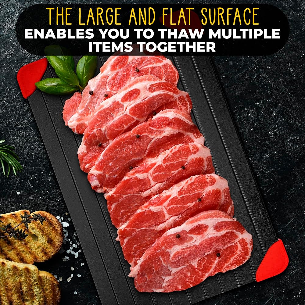 • تستخدم مع العديد من اللحوم المجمدة: تعمل صينية الذوبان هذه على تسريع عملية إزالة الجليد بحيث يمكنك إذابة العديد من العناصر، مثل الصدر واللحم المقدد والدجاج والأسماك والخضروات واللحوم.