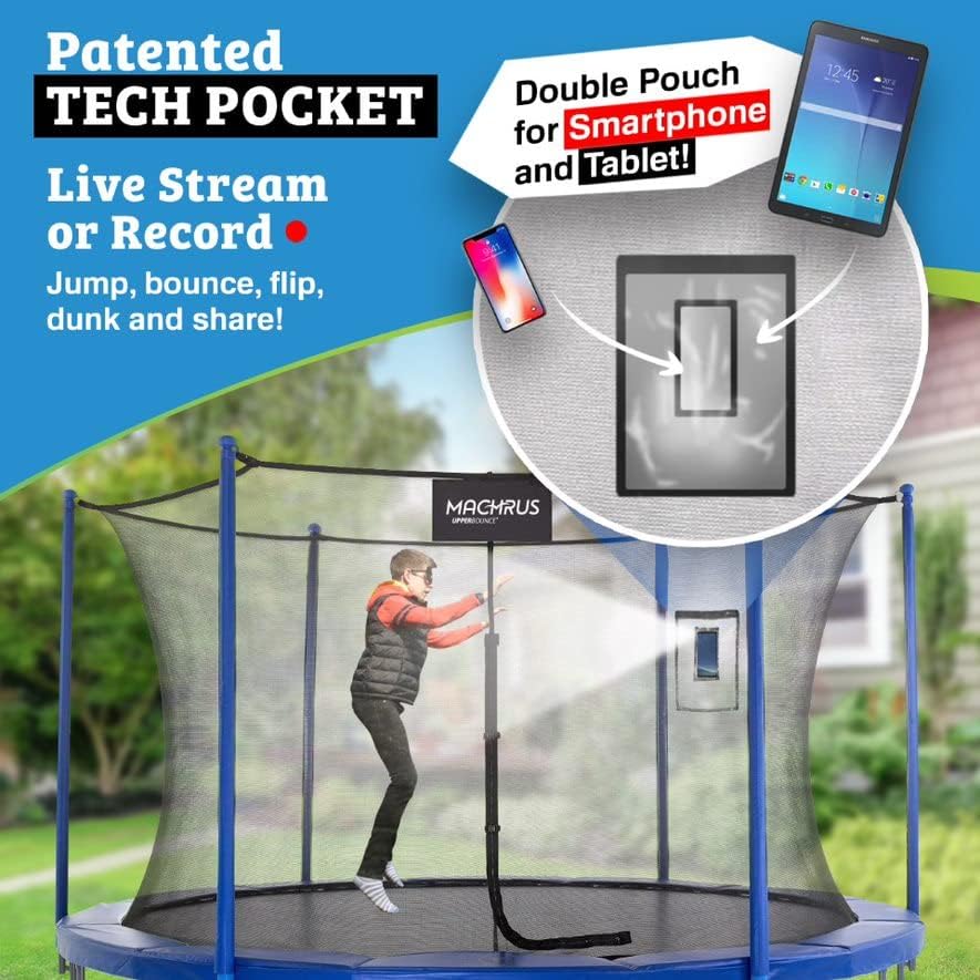 Equipped tech pocket: The Tech Pocket is designed to enhance your bouncing experience by video-recording, live-streaming and sharing your bounces, flips and moves while on the trampoline. The double Tech Pocket fits most handheld devices such as smartphones and tablets.