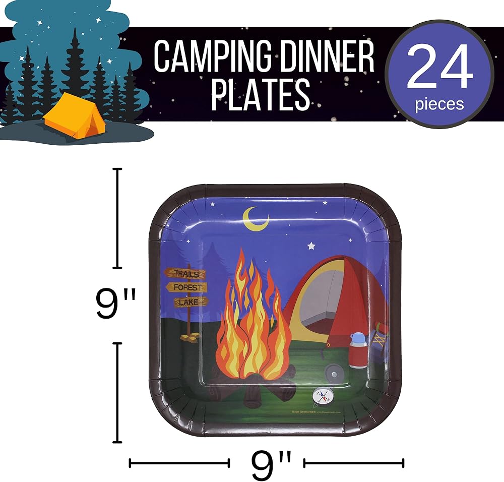 أطباق عشاء للتخييم من Blue Orchards 24 عبوة - أطباق بطابع التخييم، مستلزمات حفلات أعياد الميلاد للتخييم، أطباق التخييم، ديكورات الحفلات الصغيرة، ديكورات حفلات التخييم، مستلزمات التخييم