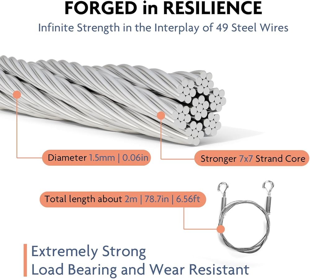 【قوة استثنائية لكنوزك】اكتشف قدرة تحمل لا مثيل لها تجلب راحة البال. تم تصميم حبل السلك الفولاذي الخاص بنا لدعم أغراضك القيمة، مع ثقب يصل إلى 80 رطلاً، مما يضمن بقاء كنوزك العزيزة آمنة.
