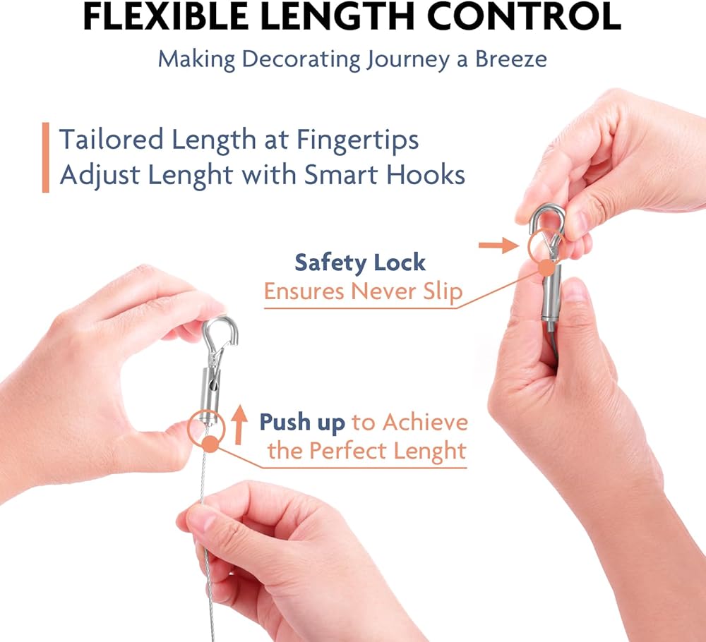 【إعادة تعريف البساطة】تبسيط رحلة التزيين الخاصة بك مع حلول سهلة. تم تصميم الخط المعدني الخاص بنا لإعداد خالٍ من المتاعب، مما يسمح لك بالاستمتاع بعملية عرض أعمالك الفنية أو أي تركيبات تعليق أخرى.