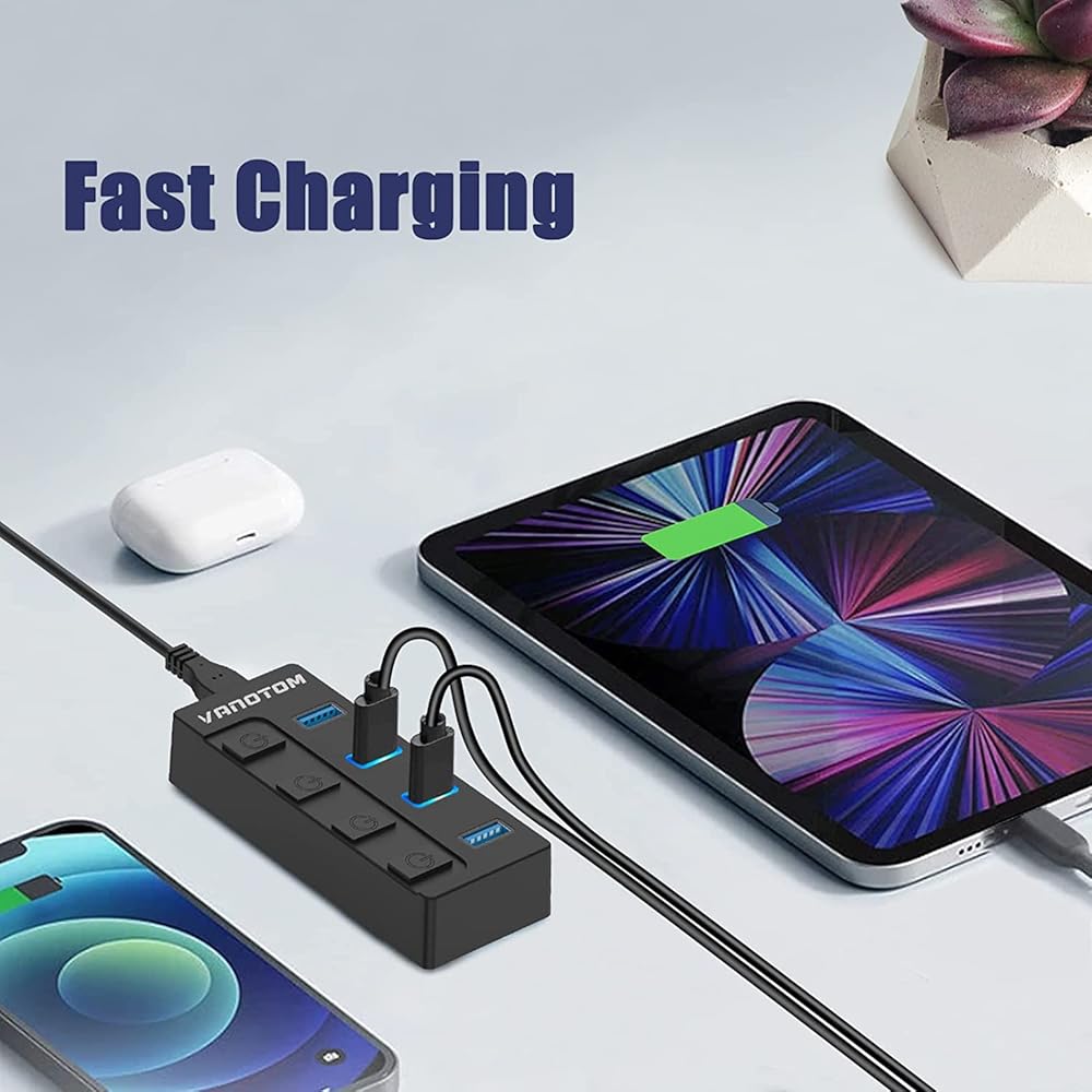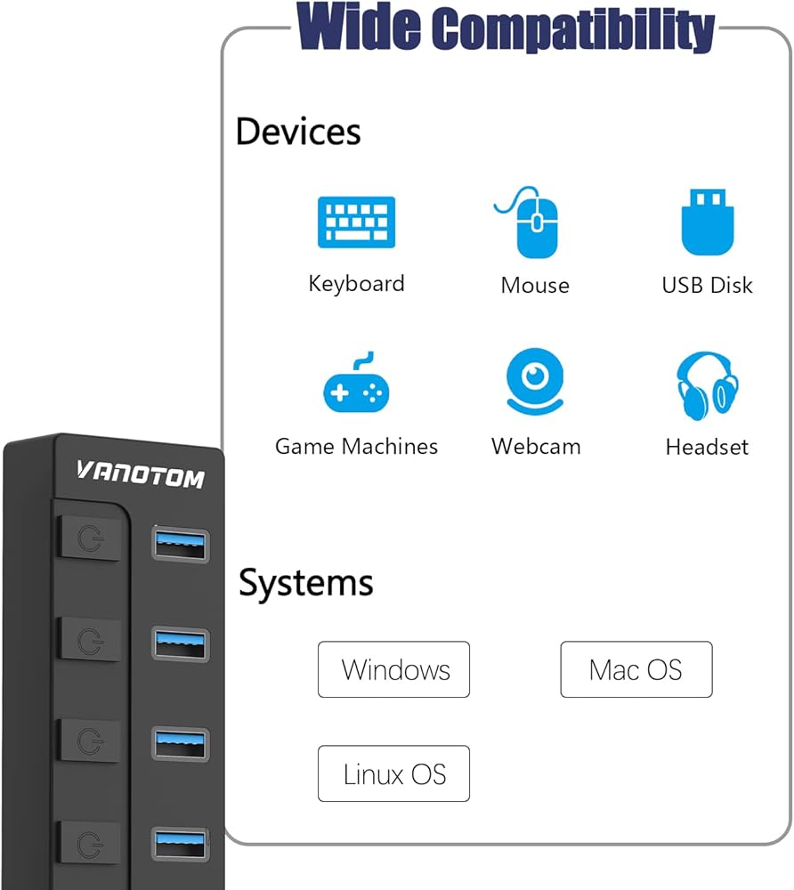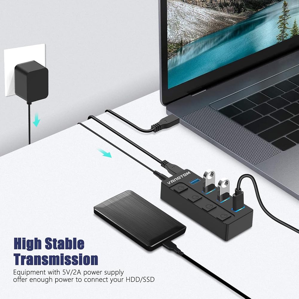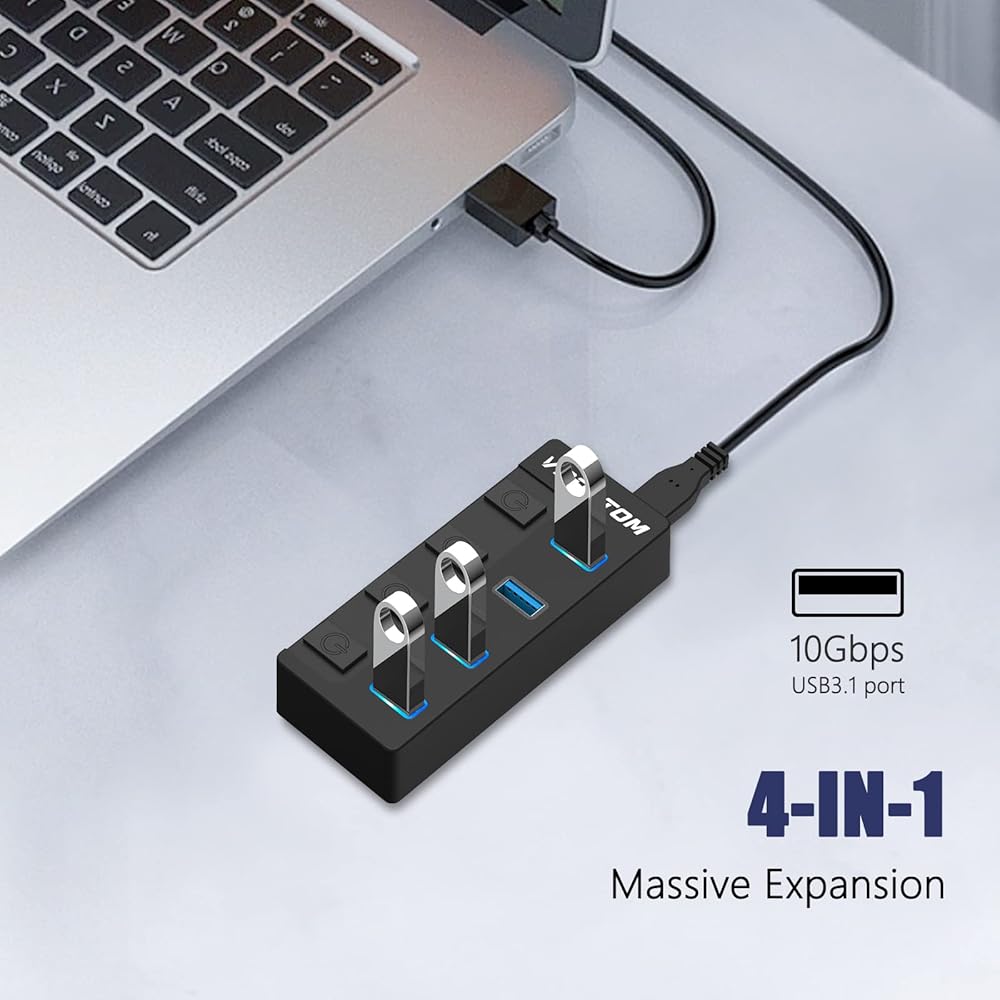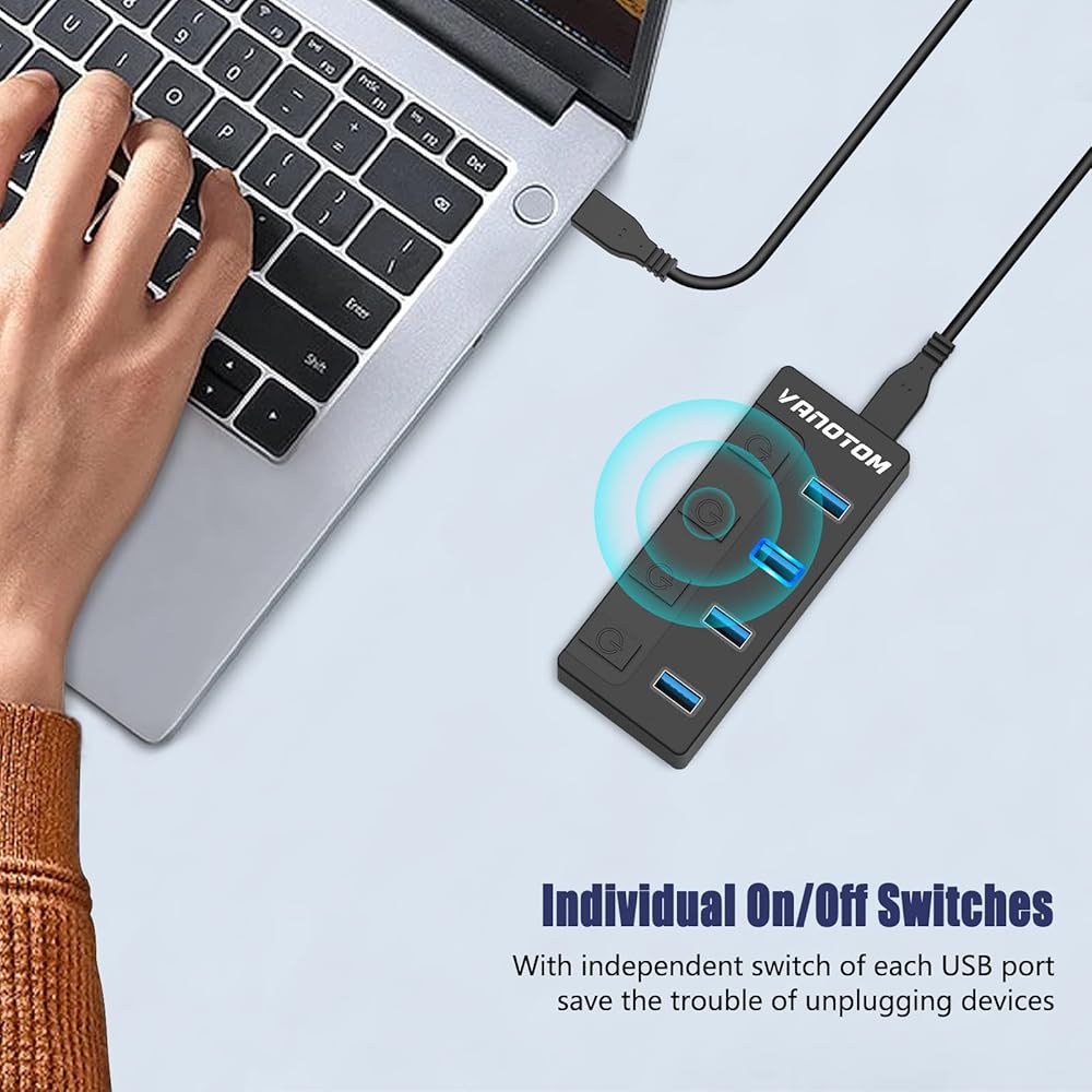 مفاتيح فردية: محور USB مزود بمفاتيح تشغيل/إيقاف فردية وإضاءة LED للتحكم في كل منفذ USB، مما يوفر مشكلة فصل الأجهزة عندما لا تحتاج إليها. قم بتشغيل/إيقاف المنفذ حسب حاجتك.