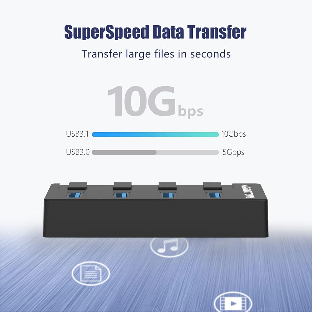 منافذ USB متعددة: قم بتمديد 7 منافذ USB من محور USB 3.1 gen2 هذا إلى سطح المكتب أو الكمبيوتر المحمول أو التلفزيون الذكي أو مضيف الألعاب لمحركات الأقراص الصلبة ومحركات الأقراص المحمولة والماوس والكاميرا وقارئات البطاقات والطابعة وكاميرا الويب والمزيد من أجهزة USB.