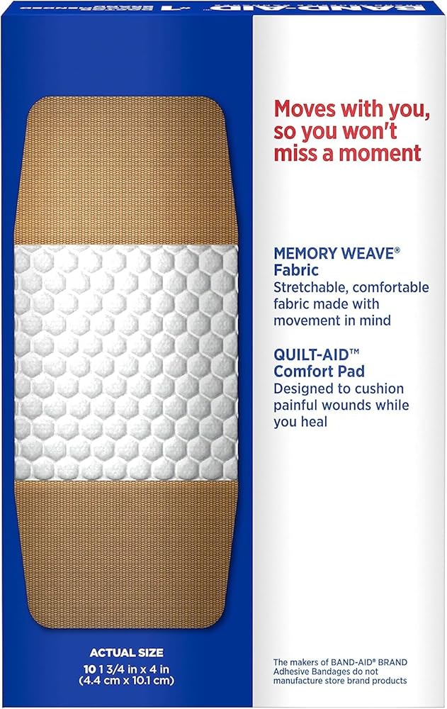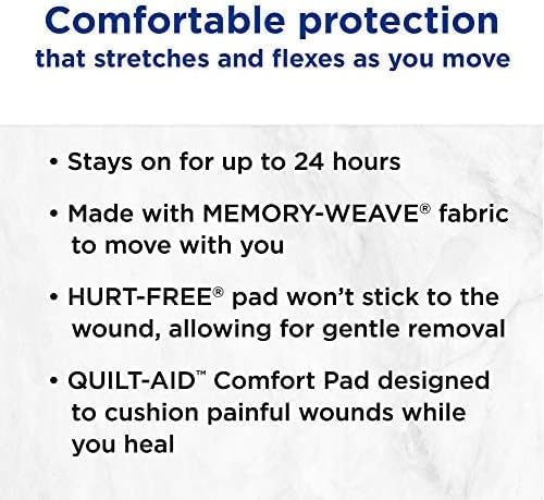 • Made with Memory-Wave fabric for comfort and flexibility, these bandages stretch, bend, and flex with your skin as you move, and include a Quilt-Aid Comfort Pad designed to cushion painful wounds which may help prevent reinjury