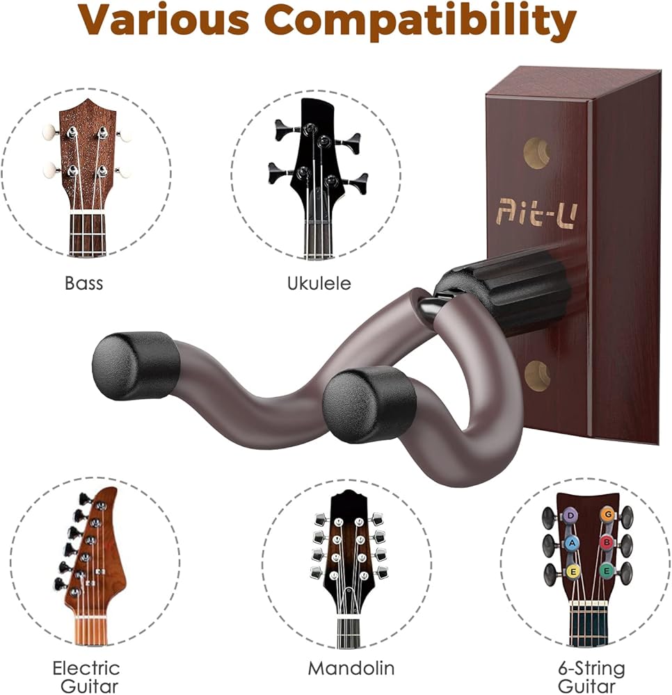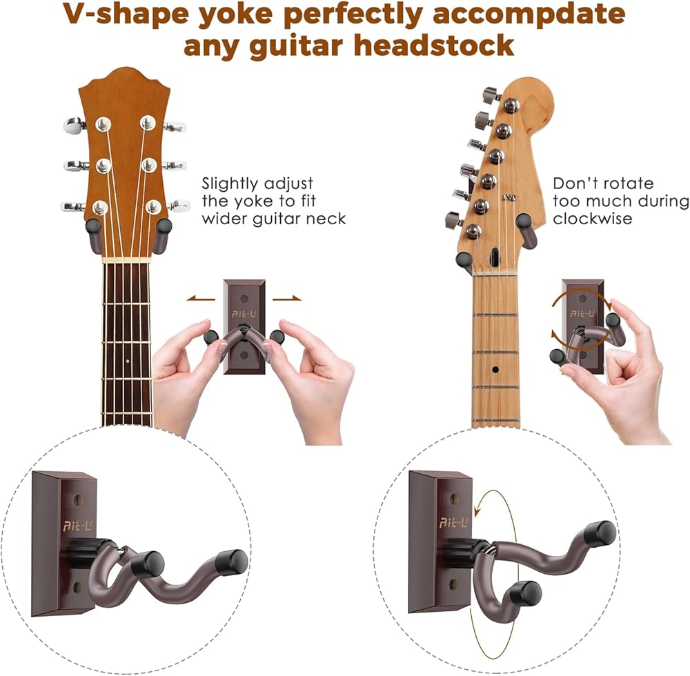 【Rotatable for Wide Compatibility】The yoke of Ait-u guitar wall hanger is intended to rotate slightly to accommodate non-symmetrical headstocks. This wall guitar mount will securely hold your Electric, Acoustic, Classical or Bass guitars, Ukulele, Banjo, Mandolin and other string instruments(suitable for guitar headstock sizes above1.97 inches, weight under 33lbs).