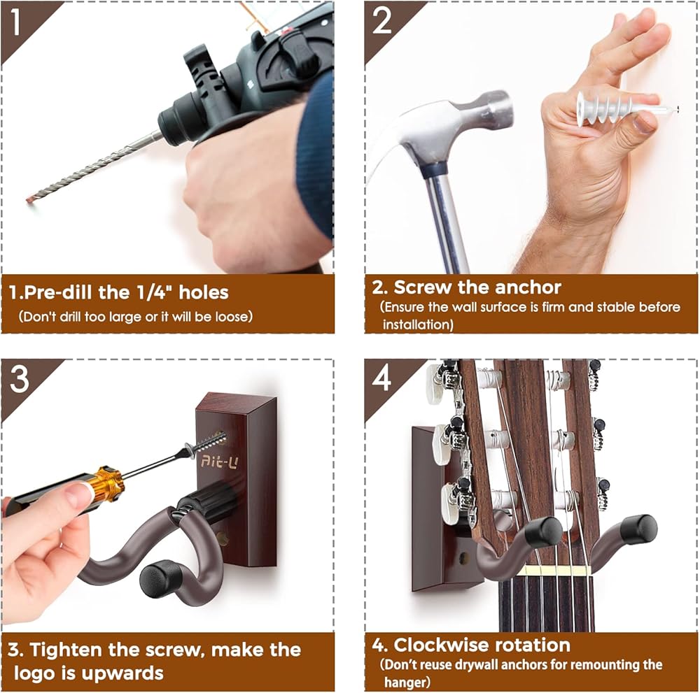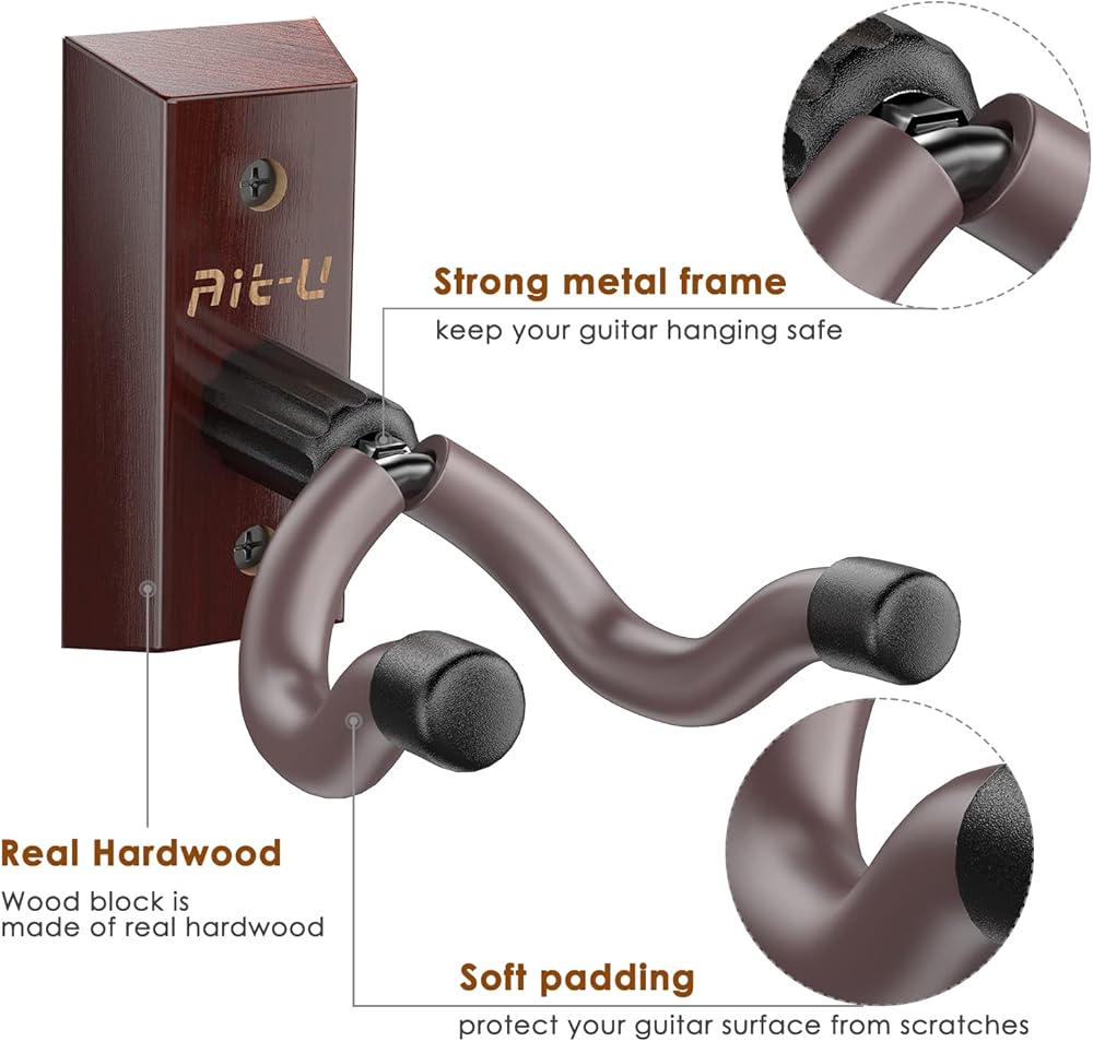 【Friendly Design & Better Protection】Hard Wood Base and all-steel construction, a soft sponge cover on the guitar hooks for wall, protect your guitar from scratches. Compared 4 screws and drywall anchors before, the updated have 5, keep one spare. Ait-u guitar mount will better protect your guitars.