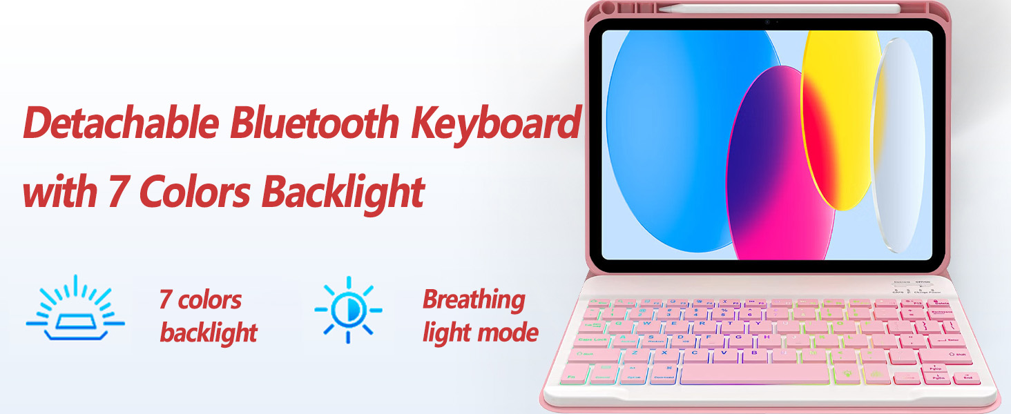 • لوحة مفاتيح بإضاءة خلفية قابلة للفصل بـ 7 ألوان: تم تصميم حافظة لوحة مفاتيح iPad هذه بمفاتيح بإضاءة خلفية محفورة بالليزر تسمح بـ 7 ألوان مختلفة بالتوهج في الظلام، مما يجعل الكتابة المتوهجة أكثر متعة وأسهل. يمكنك اختيار اللون المفضل لديك ليمنحك متعة بصرية مختلفة. يمكن ربط لوحة مفاتيح البلوتوث القابلة للفصل مغناطيسيًا بالحافظة الواقية لجهاز iPad ويمكن إزالتها عند عدم الحاجة إليها. مفاتيح مريحة مع وظيفة الارتداد لتقليل الضوضاء لتجربة كتابة مريحة