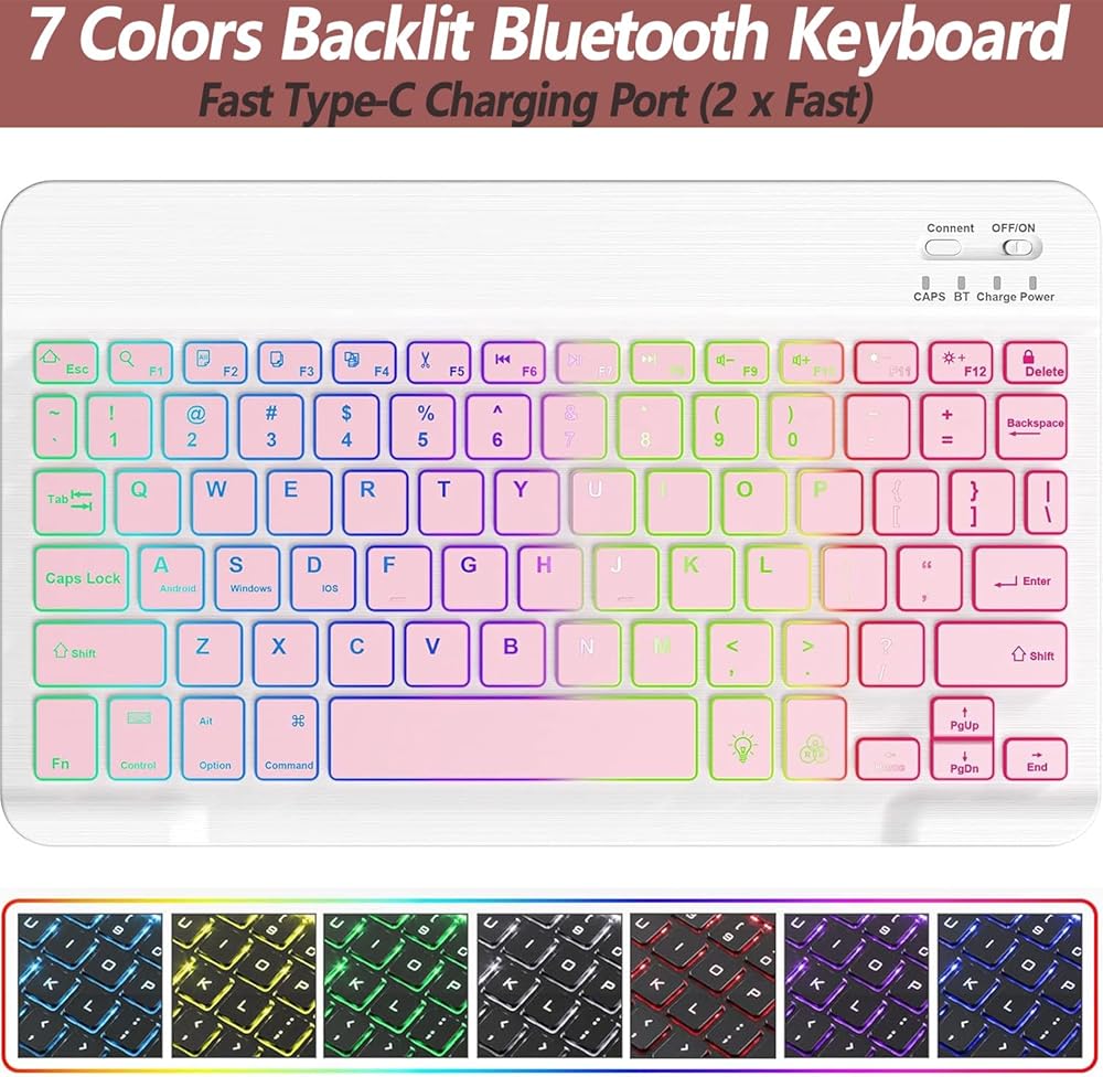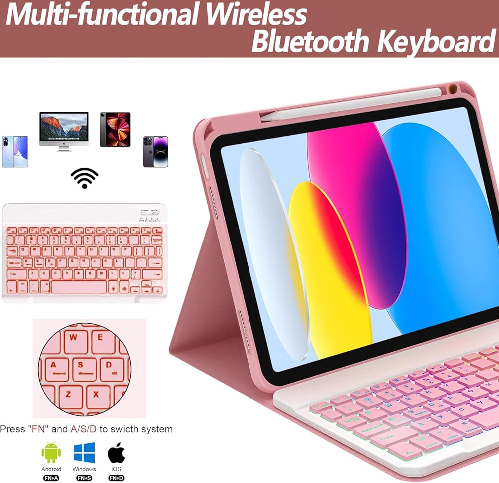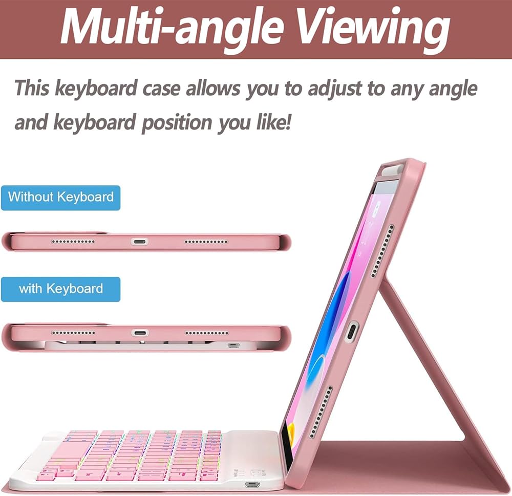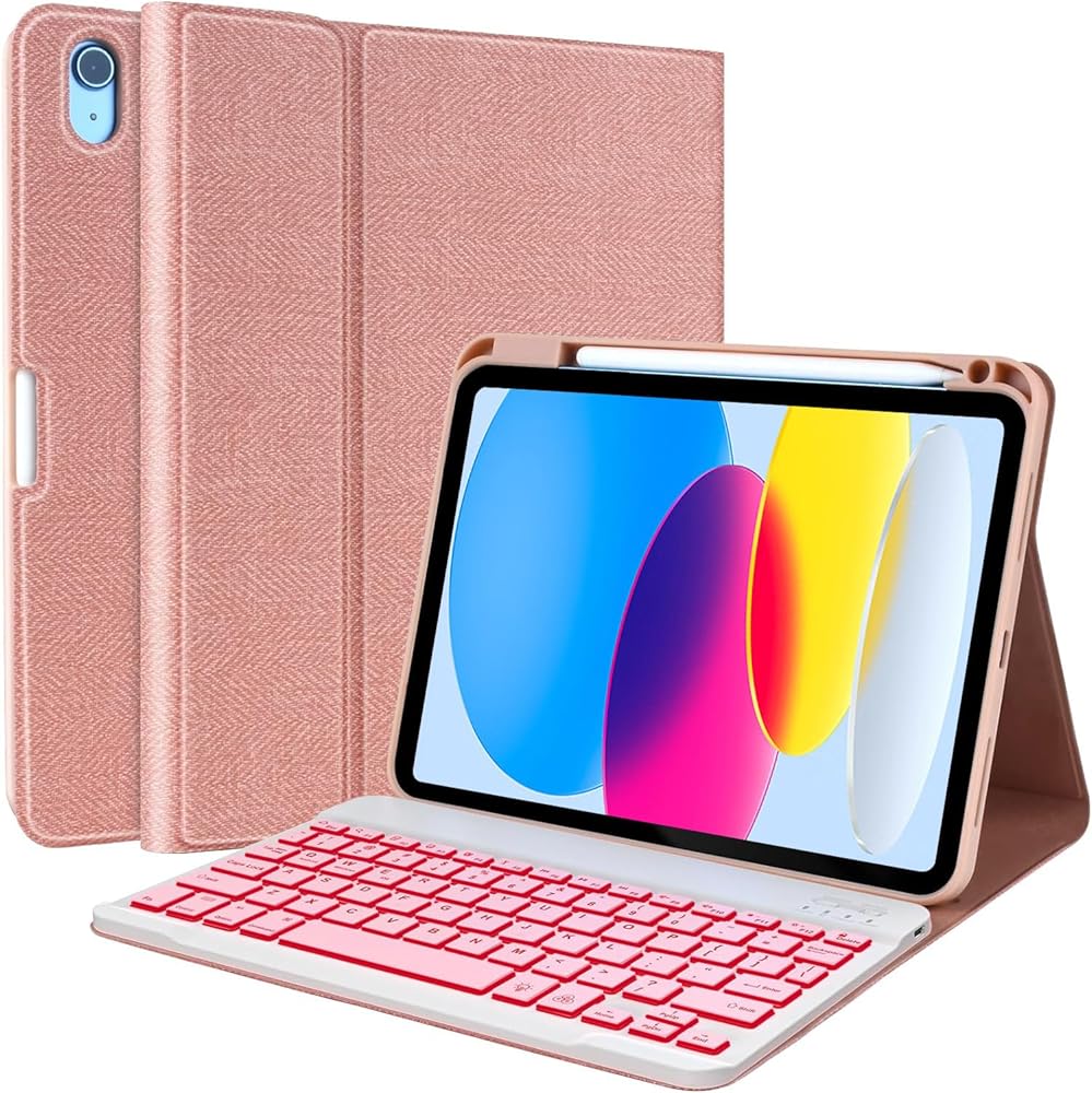 حافظة آيباد الجيل العاشر مع لوحة مفاتيح 2022 مقاس 10.9 بوصة - 7 ألوان بإضاءة خلفية، لوحة مفاتيح بلوتوث لاسلكية قابلة للفصل - غطاء فوليو ذكي مع حامل أقلام - حافظة لوحة مفاتيح آيباد الجيل العاشر، ذهبي وردي