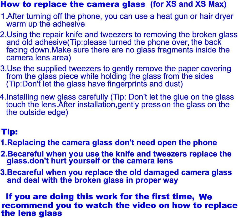Please becareful when you replace old camera glass for iPhone xs and for iPhone xs max and deal with the broken glass in proper way.No instructions in the package.If you are the first time to do this job,we suggest you check the video in internet